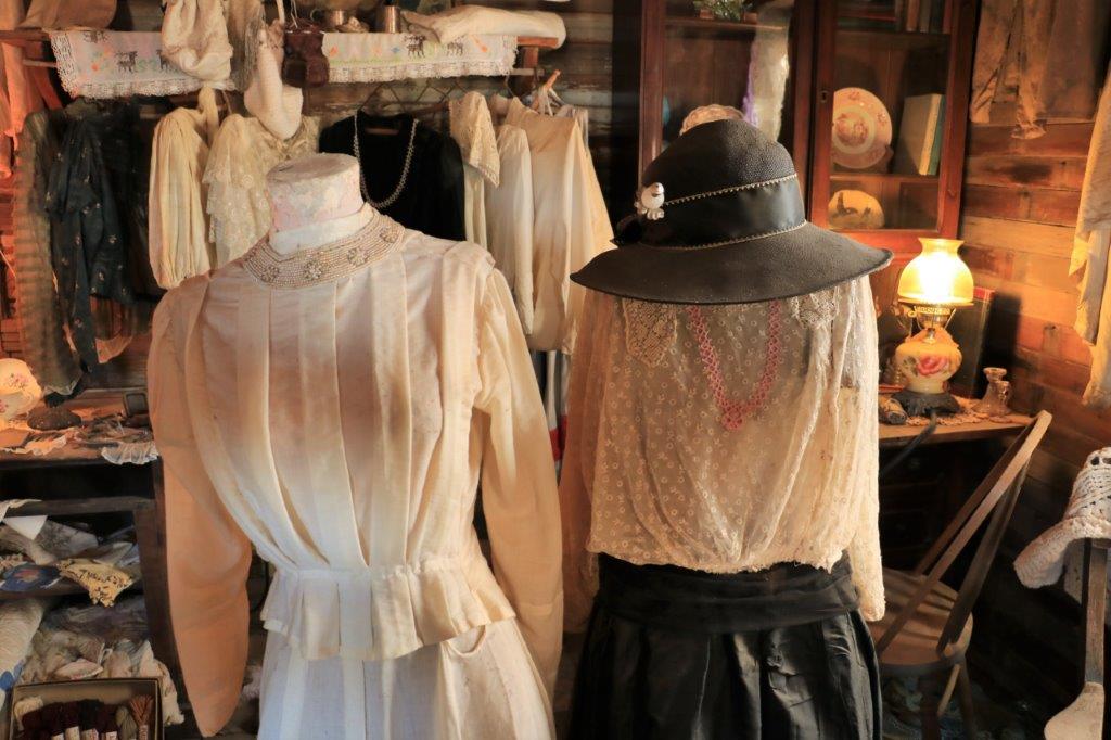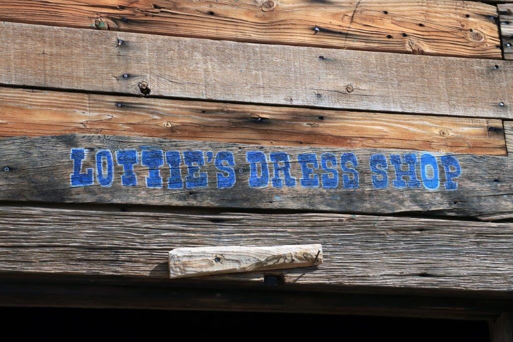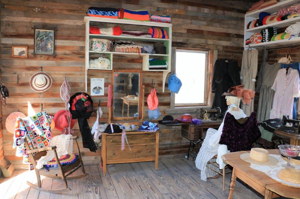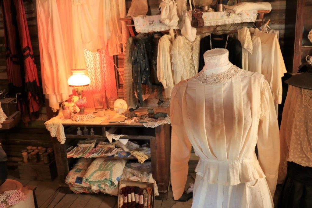 The Dress Shop had a roped off section at the back with what looked like authentic period costumes. Some of the ones in the open section looked like they had been gathered from thrift stores or the like. I liked the way they had a display of gaudy saloon girl outfits and off in the corner were the plain gingham ones for the proper ladies.