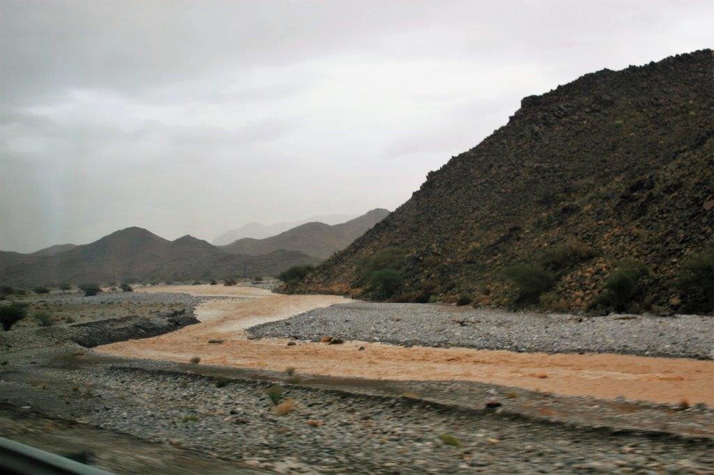 The Sultanate of Oman is a mountainous, dry desert country. There are no lakes, rivers, or streams – although there are several oases with fresh water pools. All the water for the 3.5 million population is supplied by de-salination and wells. It does rain in Oman several times a year but the rain we got that day was much longer in duration and a heavier downpour than they have had in many, many years.