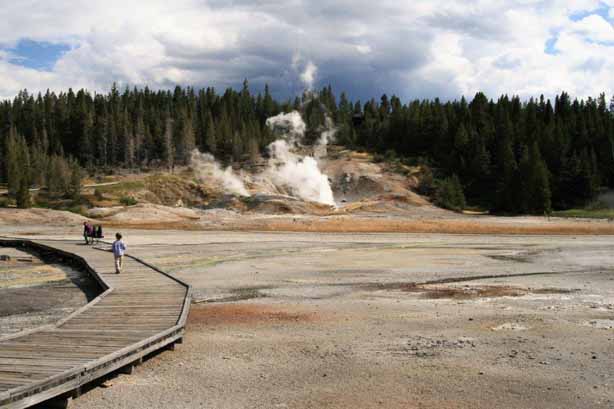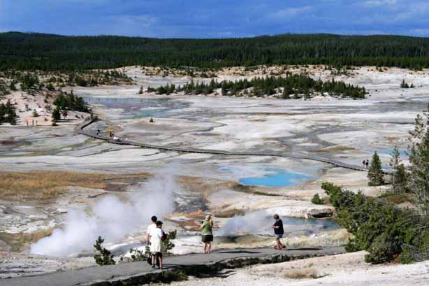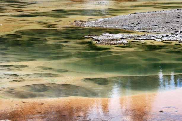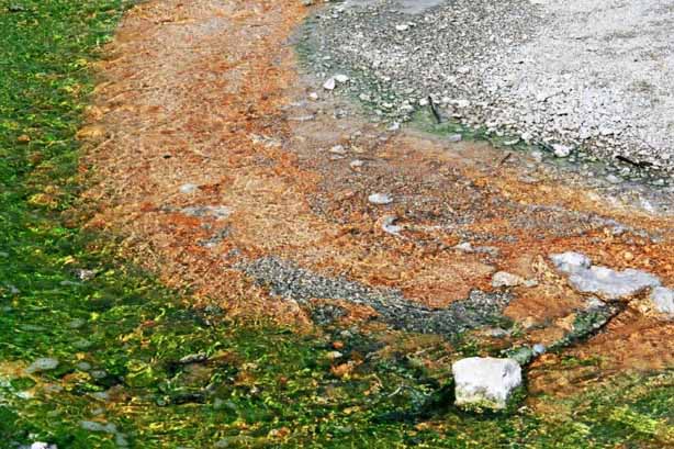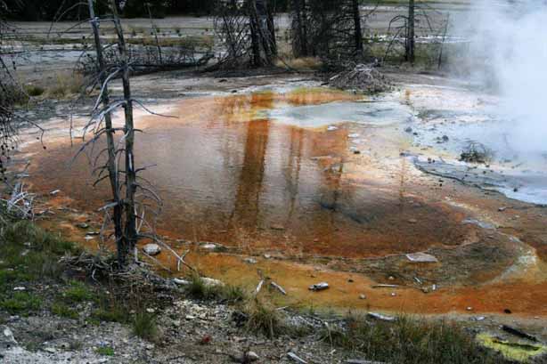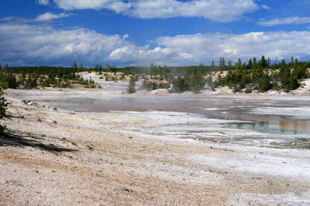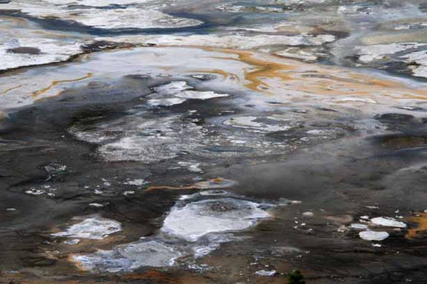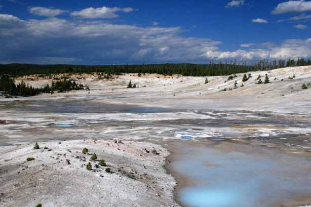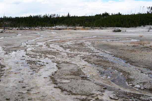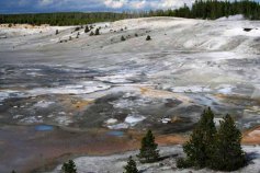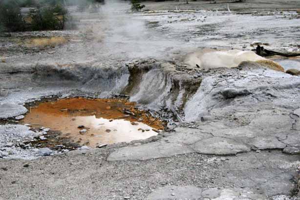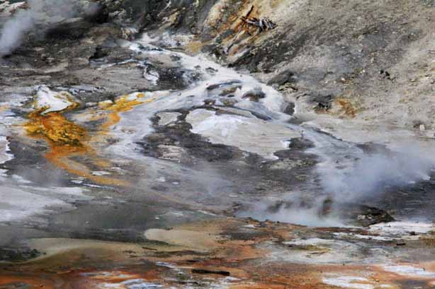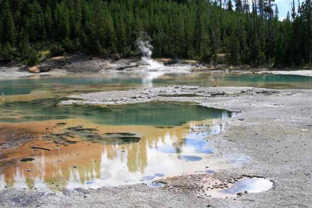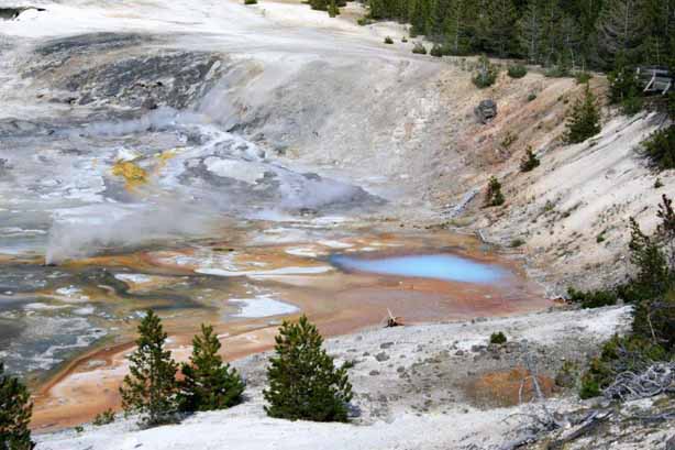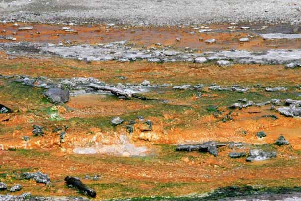 Unlike the rest of the park, the waters from Norris Basin are acidic, not alkaline, so a different class of bacterial thermophiles live at Norris creating formations, patterns, and colours unlike those in other areas of the park.
