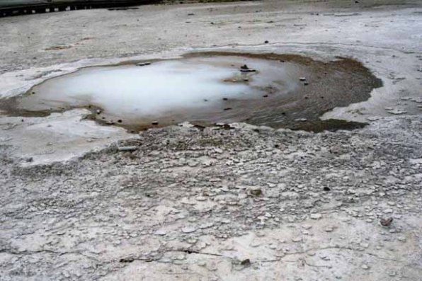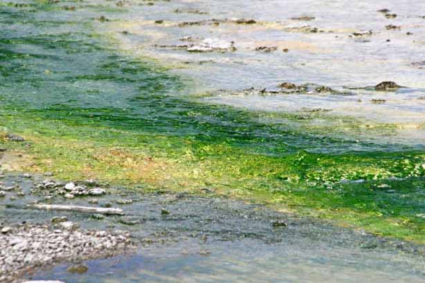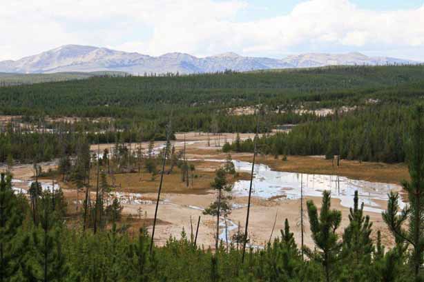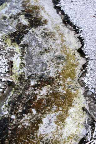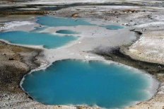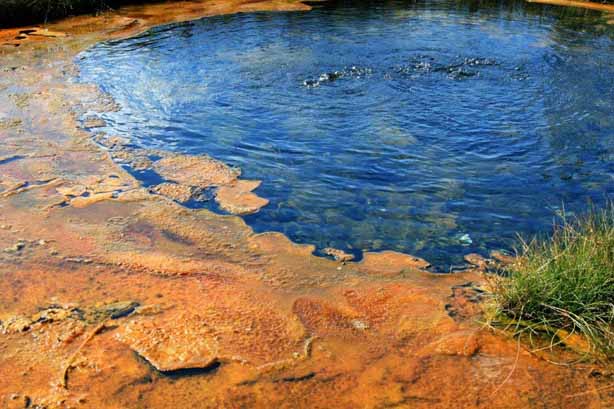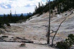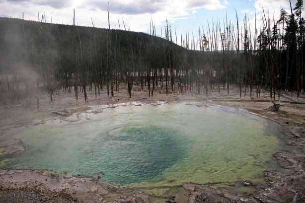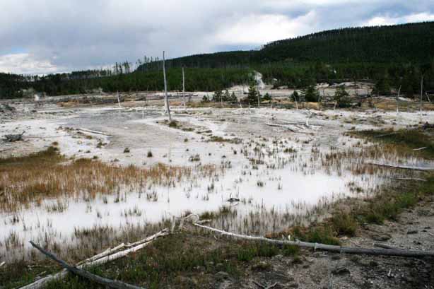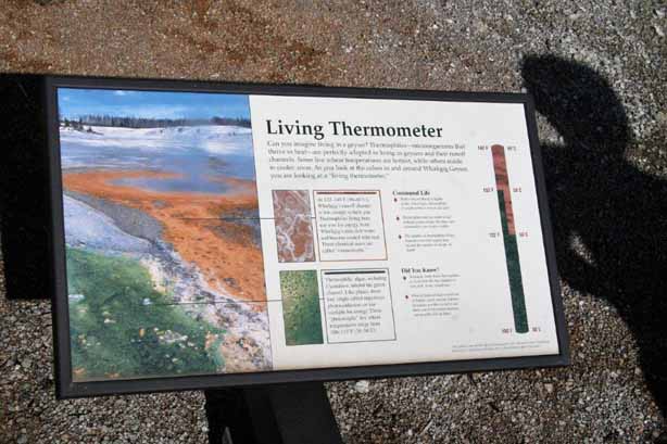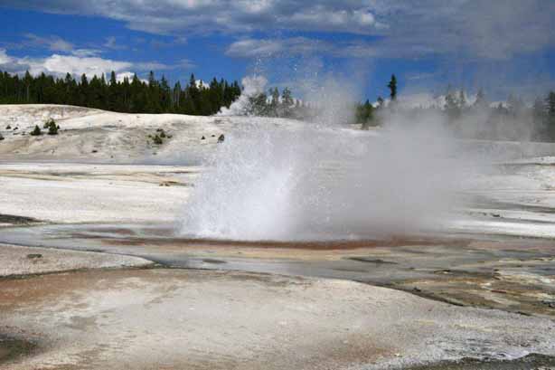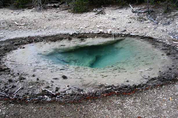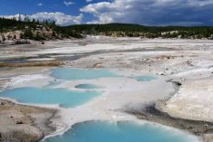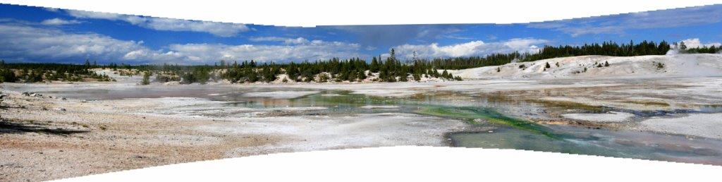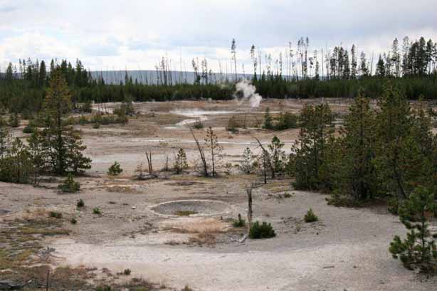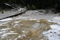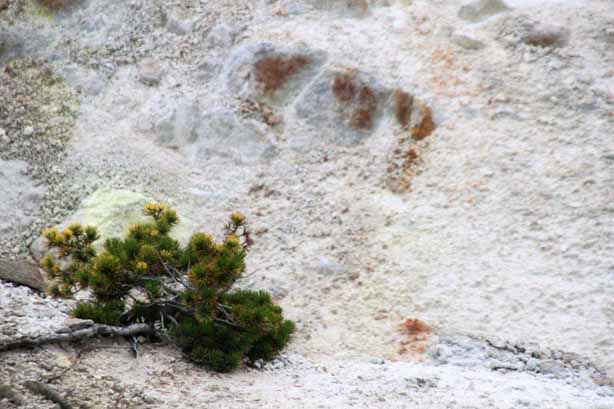 Unlike the rest of the park, the waters from Norris Basin are acidic, not alkaline, so a different class of bacterial thermophiles live at Norris creating formations, patterns, and colours unlike those in other areas of the park.