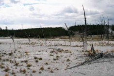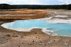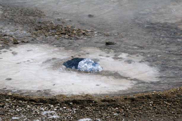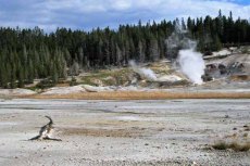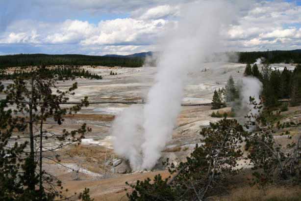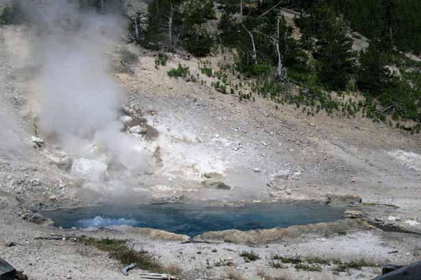 Steamboat Geyser is constantly venting steam and is the world’s tallest geyer having sent 95.5° C ( 204°F ) steam soaring 120m (390′) into the air. It usually erupts about once a year but has had as many as 50 years between eruptions. Steamboat has no particular schedule or pattern but does have frequent smaller eruptions of accumulated steam and water.