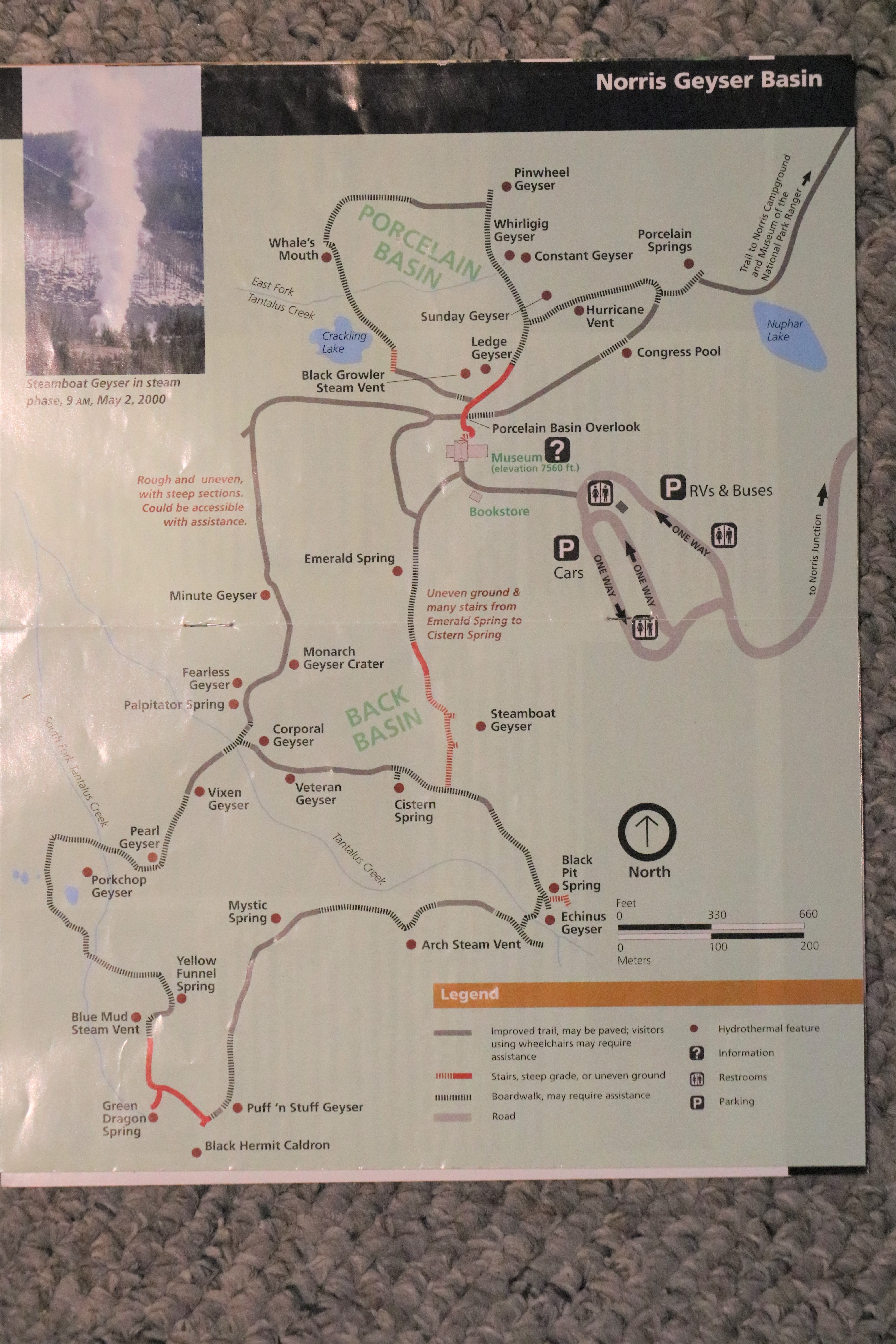 Over the course of our first day at Yellowstone I took almost 350 photos. After weeding and deleting my file for the day contains 171 pictures. Of those I have included about 90 in this blog. I know this a lot, but you must understand by now that I love to preserve my memories in ‘film.’ I have really enjoyed walking the trails of Norris again for this blog. I warn you that the next three entries will be similar.