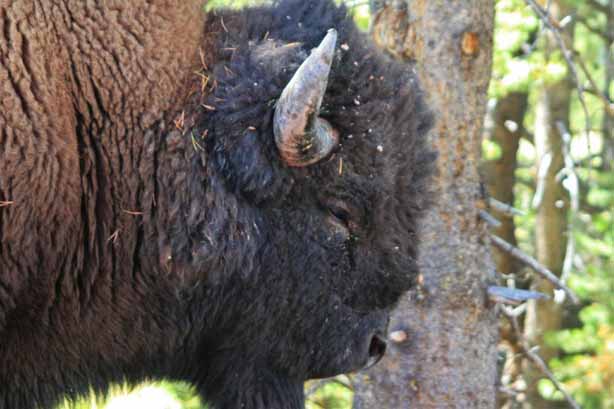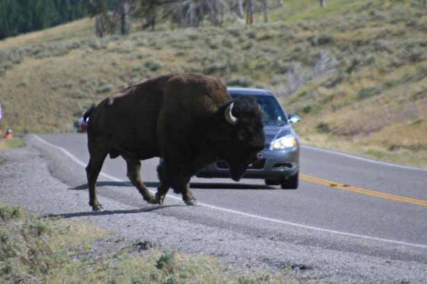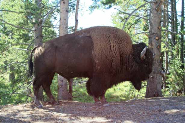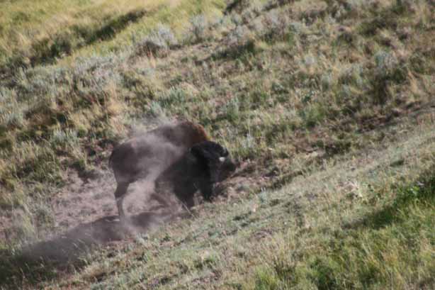 We were on our way to Mud Basin and spotted this bison having a dust bath. When he was done he wandered up the hill and right down the middle of the road. Just like in the preserves in Africa, animals have the right-of-way in Yellowstone. Traffic just had to stop until he walked off the road and into the forest.