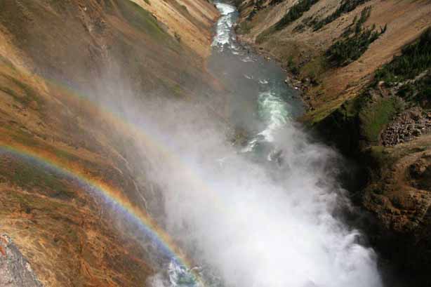 The forceful spray of the waterfall on a sunny day causes rainbows to form on the canyon walls.