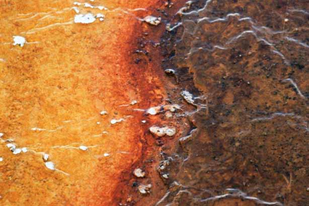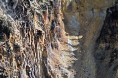 The canyon walls contain a variety of different iron compounds and exposure to the elements caused the rocks to change colour. The rocks are oxidizing, in effect, the canyon is rusting. Most of the yellows in the canyon are the result of iron present in the rock rather than, as many people think, sulphur.