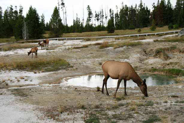 There were a few elk eating the grass and drinking the fresh water at the lake.