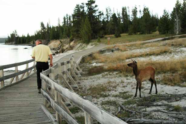 John was walking along, keeping an eye on a female elk down by the lake, not realizing that it’s fawn was on the other side of the boardwalk. Fortunately momma elk did not get upset when he walked between them.