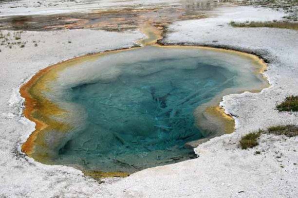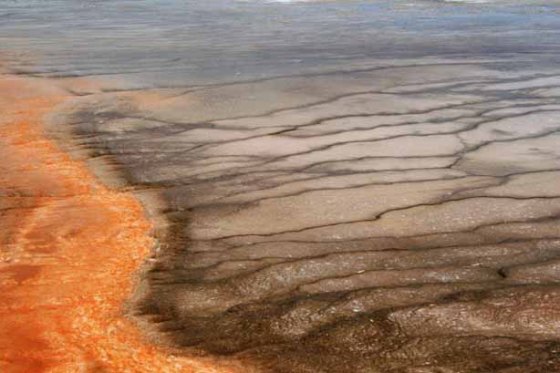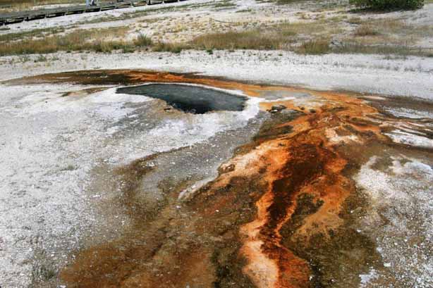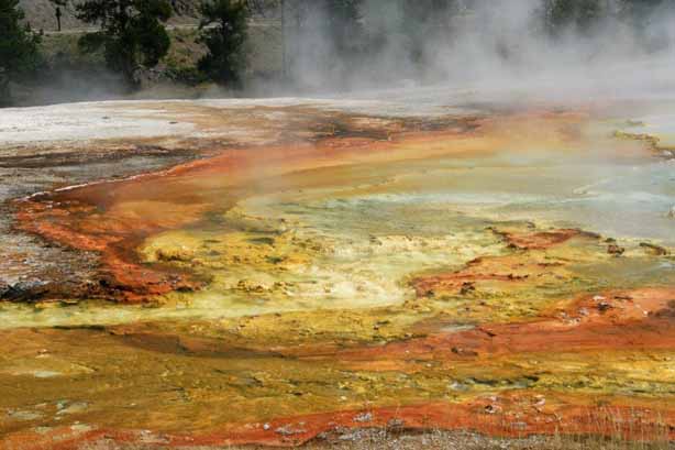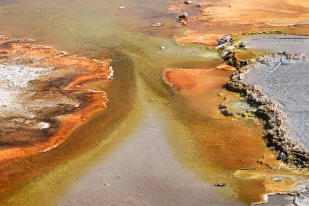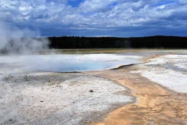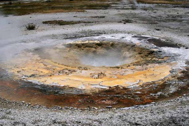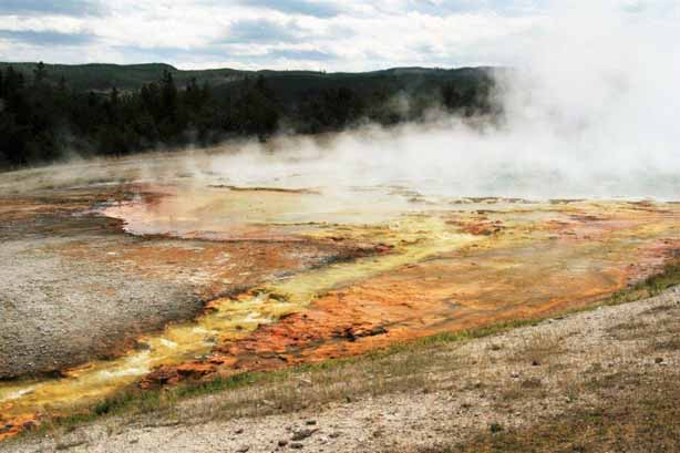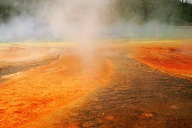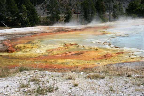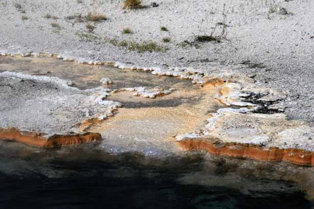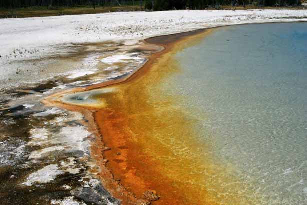 The shore of Sunset Lake looks a lot like the Grand Prismatic Spring.