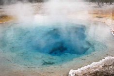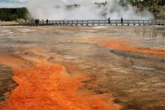 A part of the section about Yellowstone National Park is a ‘how to’ guide for traveling around. The book says, “At Fountain Paint Pot, a cauldron of hot reddish-pinkish mud, blooping and spitting, is always entertaining. Any hot spring could become a mud pot with the right balance of acidity, moisture, and clay; however, a constant flow of water keeps most springs clear.”