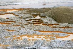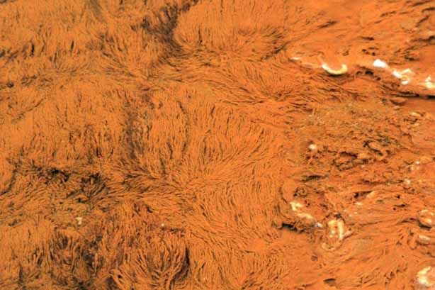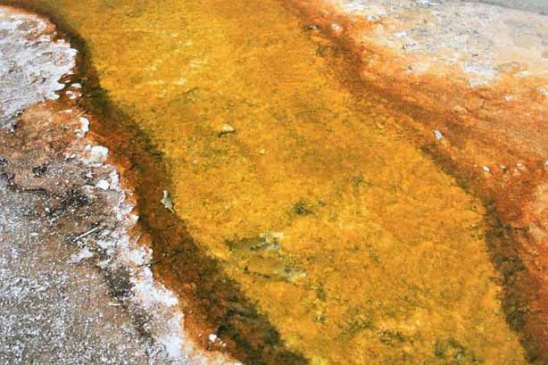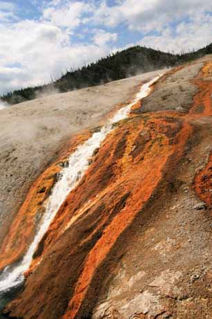 The bright orange is mineral deposits being left behind by the water as it flows over the ground surface into the pools.