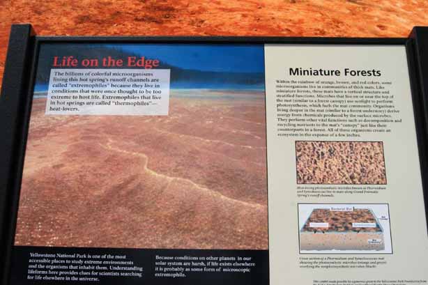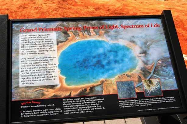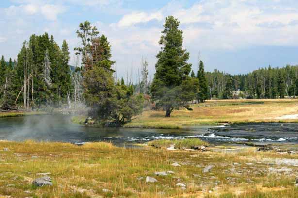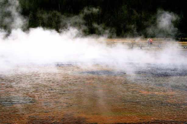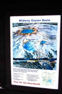 Back on the main road at the end of the Firehole Lake Drive we drove down to the Midway Geyser Basin located along the Firehole River. The river flows through several geyser basins and contains three of Yellowstone’s waterfalls. Early trappers named the lake and river for the steam that makes it appear to smoke as if on fire. The river is surrounded by geothermal activity which adds a continuous supply of heated water. This makes the river temperature 5-10° warmer than nearby rivers without geothermal activity. The water has reached a high temperature of 30° C (89° F).