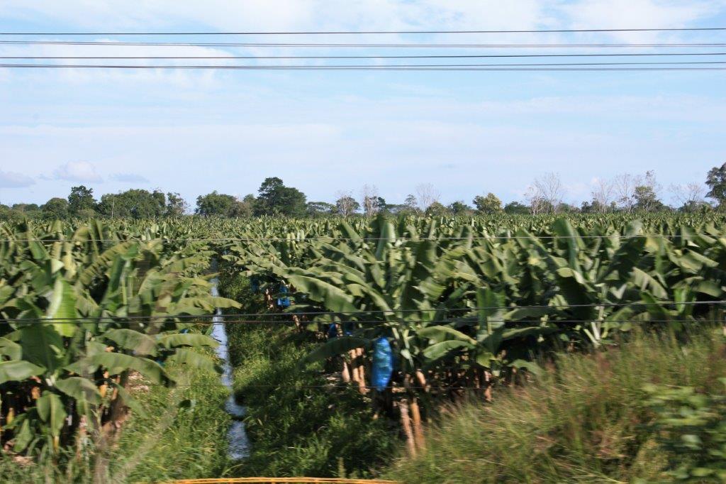 Only one bunch of bananas grows per year as it takes 9 months for the fruit to mature. After four years – so four bunches – the tree is cut down and a new one is planted. The blue plastic bags are placed around each bunch of bananas to help them mature and to protect them from pests and animals.