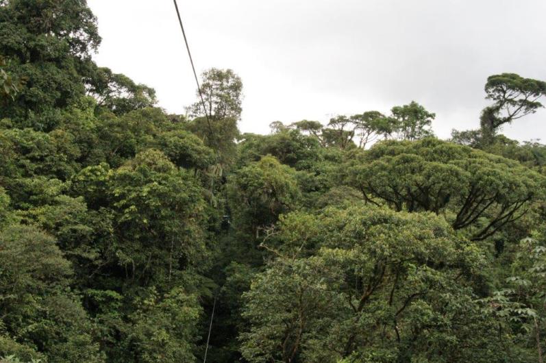 The lower, outbound leg of the tram ride goes over hilltops and the subcanopy. The return leg is a journey through and above the high rainforest canopy about 120′ up.