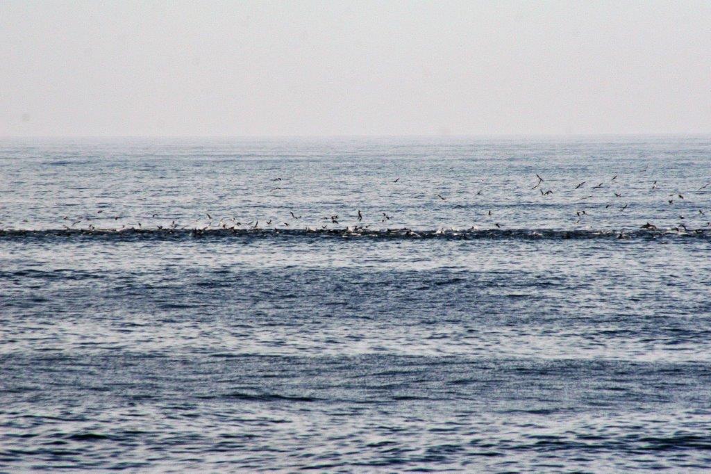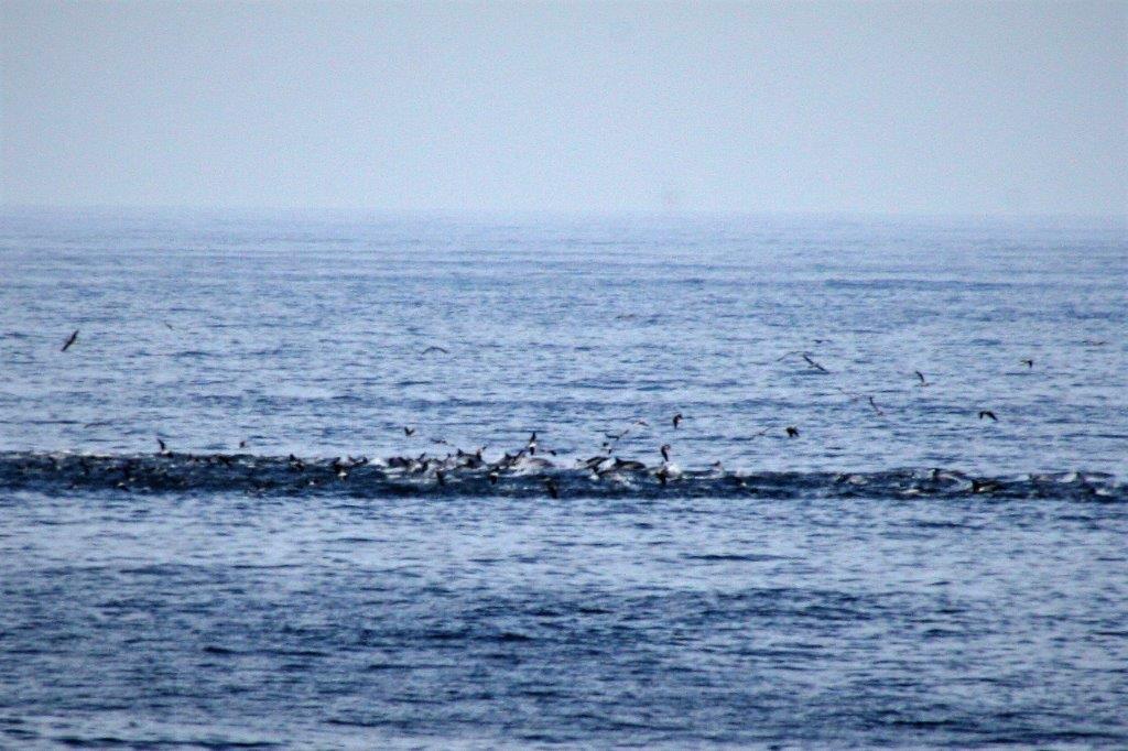 The next day was a sea day and we went on deck to read for awhile. However, since the ship is sailing southeast (we were still in the Eastern Time Zone) under the affect of the antarctic Humbolt Current it was windy and chilly and we decided instead to walk laps. As we were walked around the deck we noticed a pod of about 6 dolphins near the ship. About half- way around we spotted a huge feeding frenzy some distance off the ship’s bow. There was a large dophin pod, probably over 100, that had worked together to gather a school of fish into a tight ball and drive them to the surface where the dolphins could dart in and out and enjoy lunch. The air was alive with Brown Booby birds taking advantage of the buffet as well. Not too long before we set sail on this trip we had seen an episode of the BBC series Planet Earth where they documented how dolphins work together to do this very thing. It was fascinating to watch. The photos are not really clear since it was taking place quite a distance from the ship and I had to do some serious cropping.