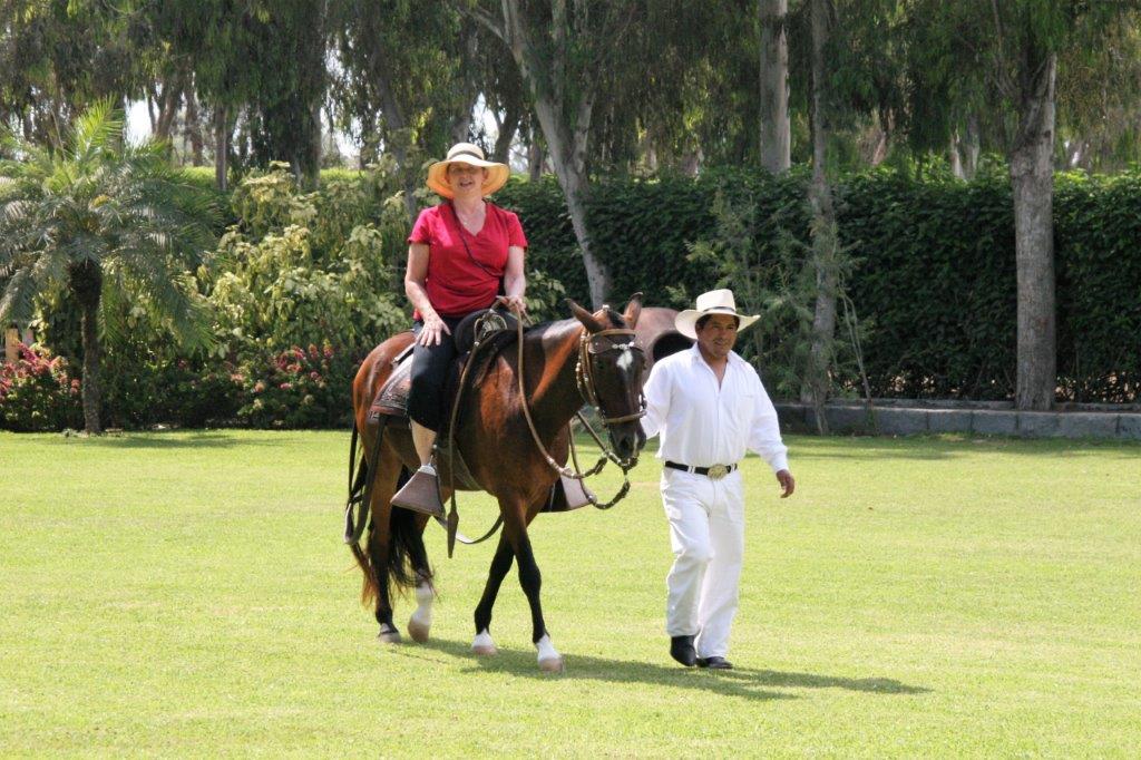 The best part – although disappointing to those of us that can ride a horse – came after a delicious Peruvian lunch, when we were given the opportunity to ride a Peruvian Paso. I totally understand that they would not allow novices to ride these valuable animals unassisted but it was a bit of a let-down to be led around the field on a lead. Still how ofen do you get the chance to ride a Paso? That will probably be my only one so I am very, very glad we could do it. Especially in their native country and such lovely surroundings. Many of the people on the tour had never been near a horse let alone ridden one so there were lots of big smiles on faces.