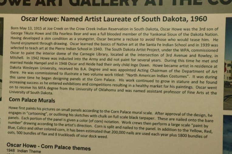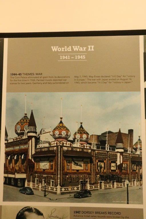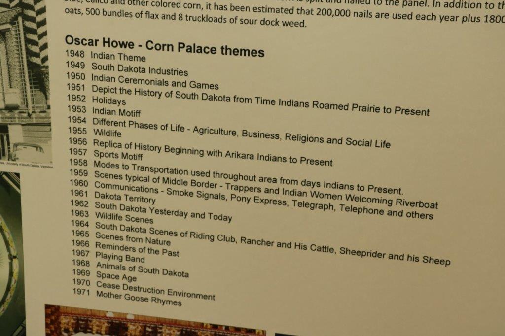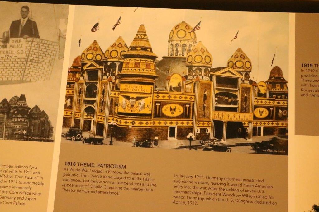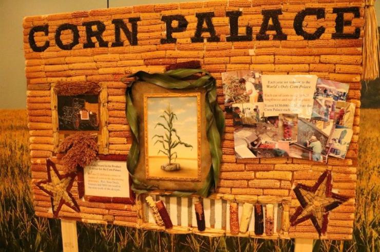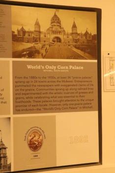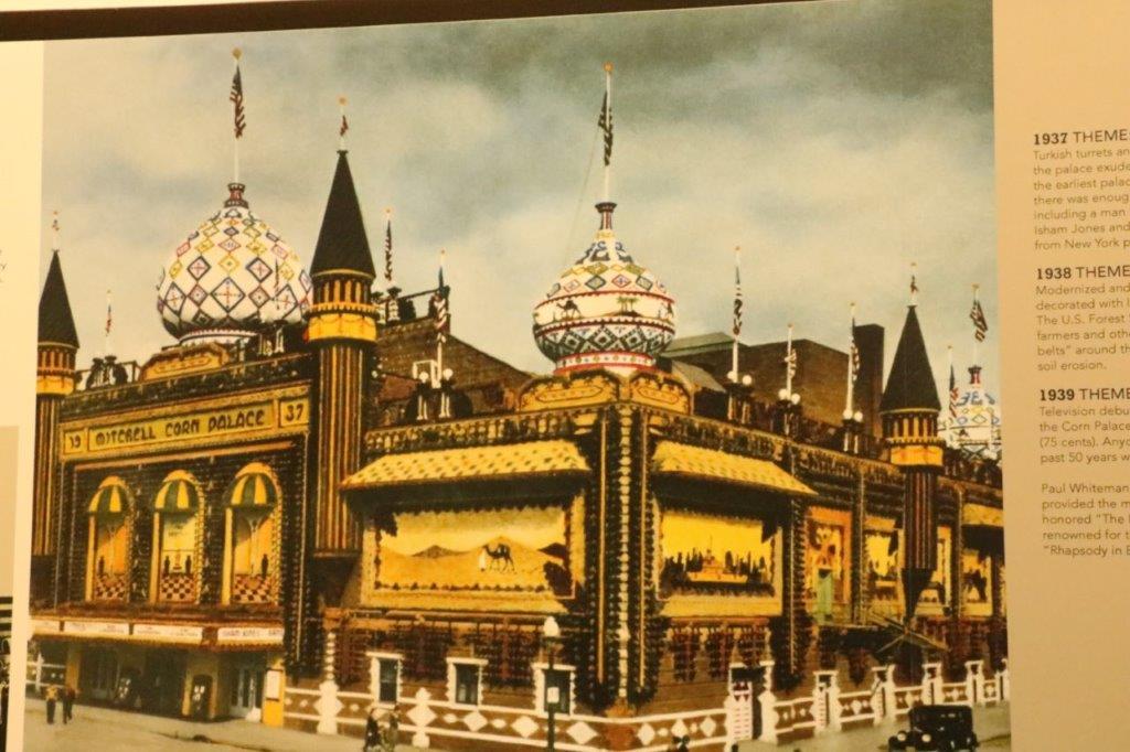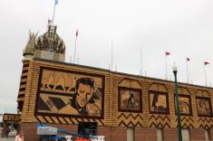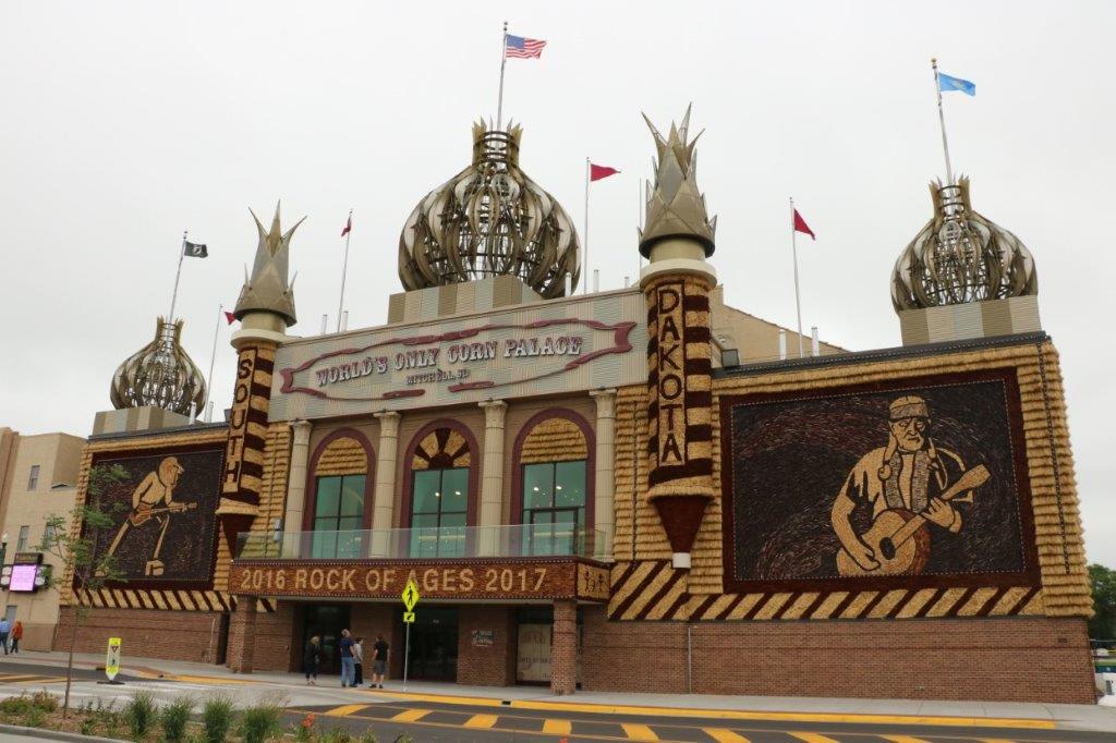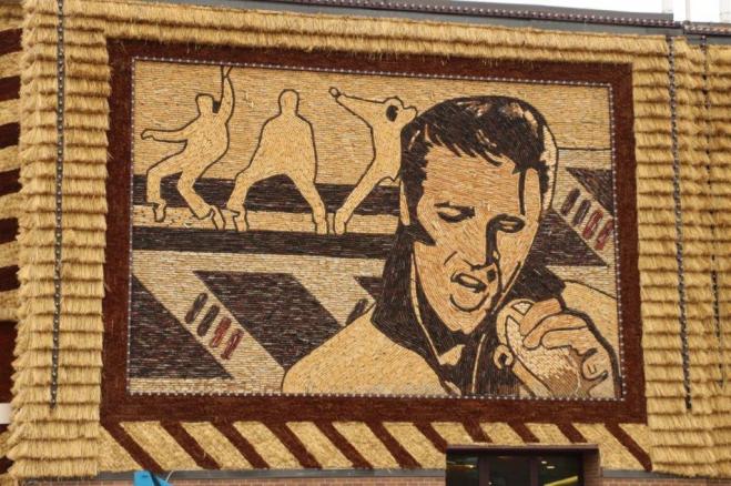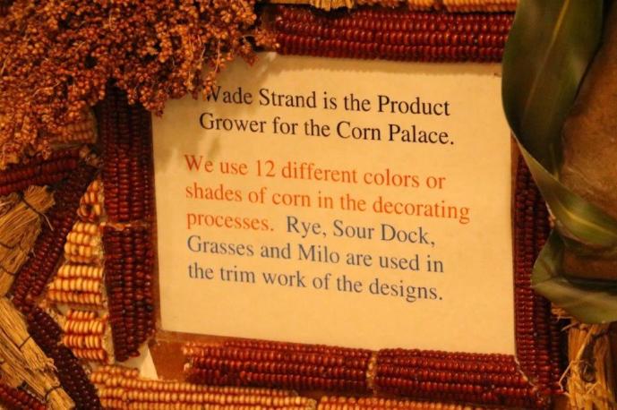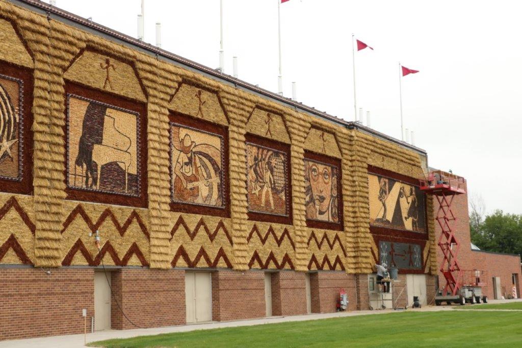 The first Corn Palace was built in 1892 to showcase the rich soil of South Dakota and encourage people to come here. They cover the two street-visible exterior walls with ‘murals’ created entirely from different colours of corn cobs, straw, and grasses. Every year the murals change and the theme changes. It was decided this year to keep the 2016 murals for another year so they are just changing one of the dates on the marquee and all of the grasses to give the palace a fresh look.