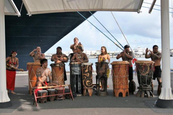 We were welcomed by local ladies handing out flowers and on the way to the buses we passed a local band, playing traditional music, dressed in traditional style. A nice touch we see quite often on the world cruise.