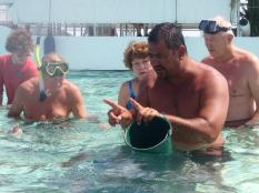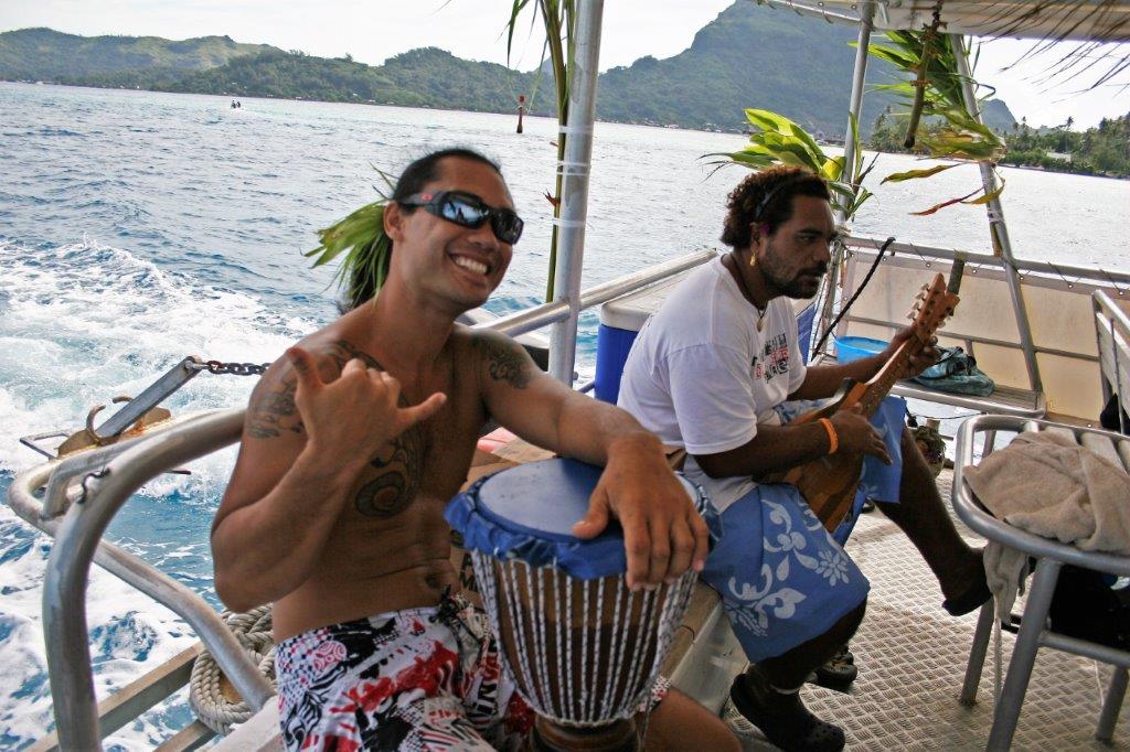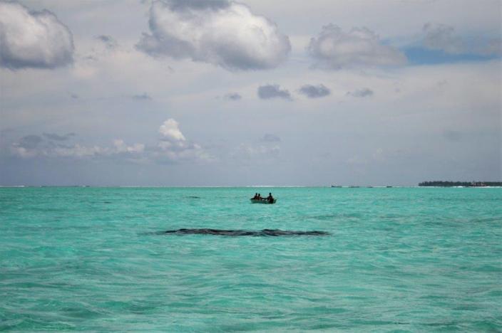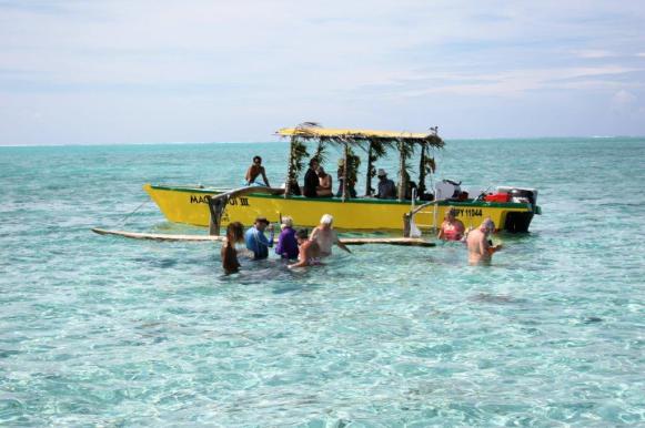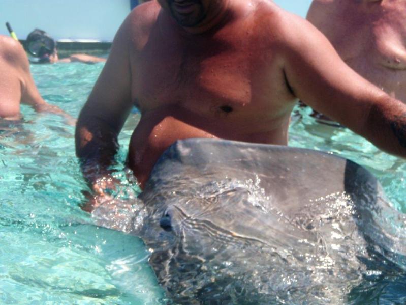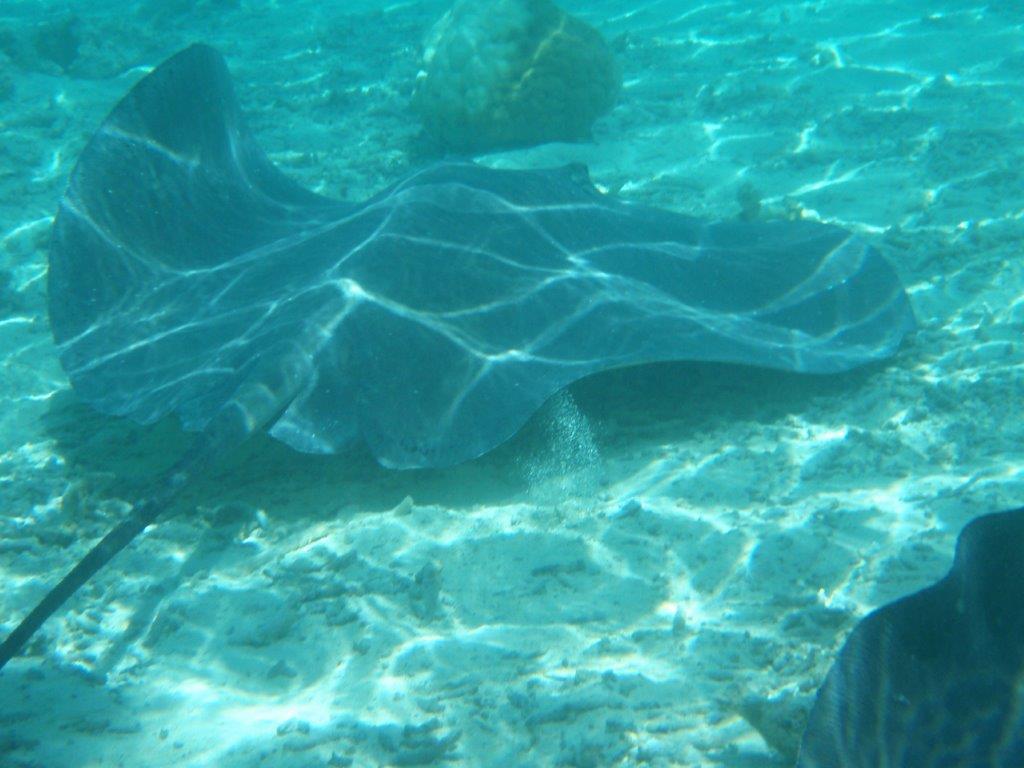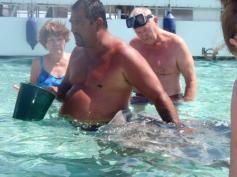 We were taken out to the edge of the lagoon in a covered launch to an area frequented by sting rays and black-tip sharks. The boat owner/guide brings along tuna fish to feed the rays and they are so used to him they will brush up against his legs and one that he calls his pet will actually rest on his stomach while he pets it.