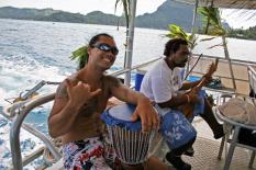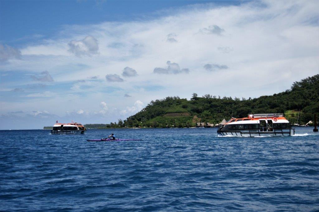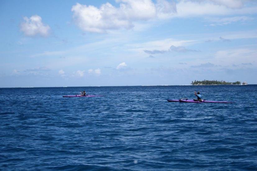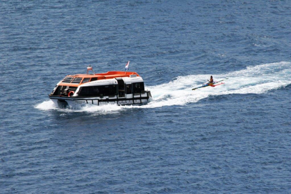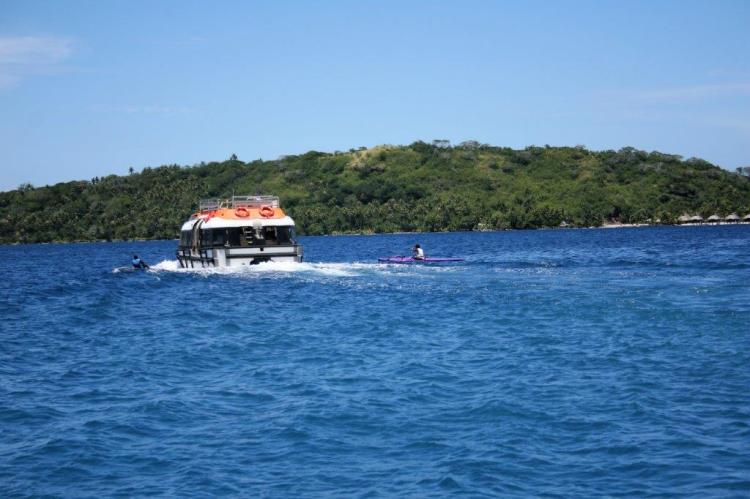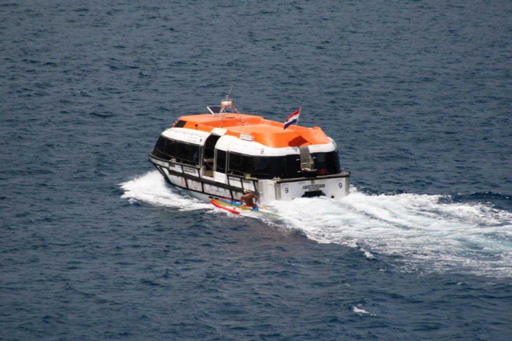 Local men take their outrigger canoes into the lagoon and ‘surf’ behind the tenders as they go back and forth to the ship.