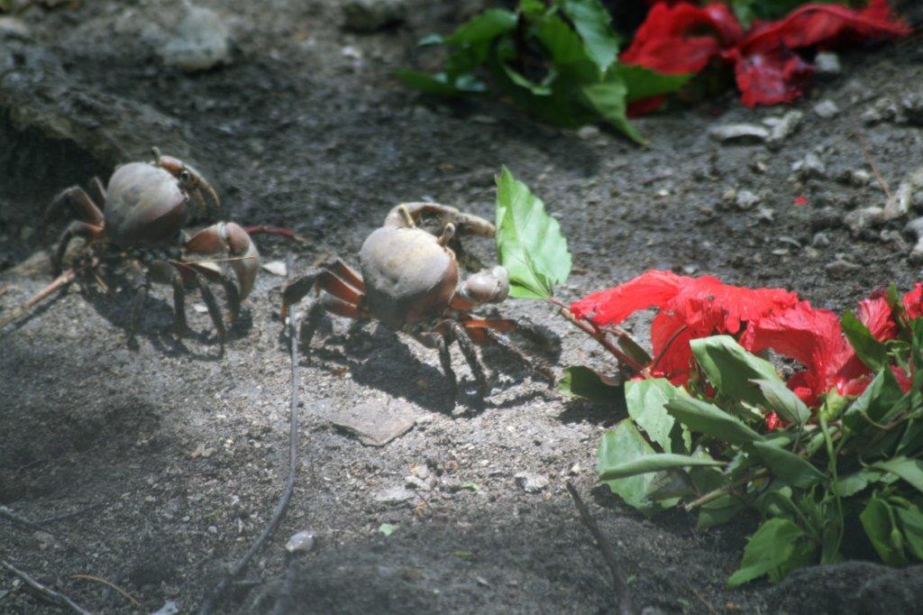Bora Bora has only one example of wildlife: the tupa crab. Our driver stopped beside the road where a colony of the crabs live and he and our guide threw hibiscus blossoms on the ground. These big crabs scuttled out of the holes in the ground as quick as could be and dragged the flowers inside as fast as they could. They are normally nocturnal, not leaving their holes until late at night to search for leaves and flowers to eat.