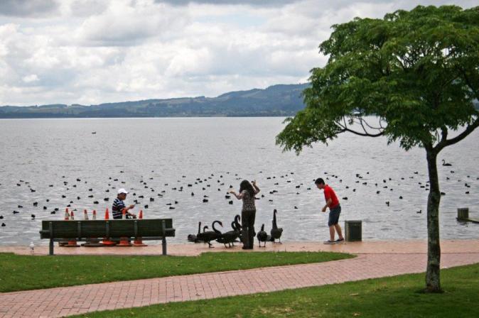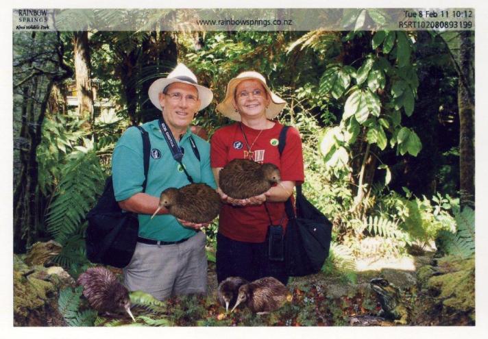 We were up at 7 am to be ready for our all-day tour. The bus was loaded and on its way by 8:15. It was about an hour’s drive to Rotorua City and Rainbow Springs Wildlife Park. We drove through farmland; mostly cattle ranches or kiwi farms. The production of kiwi fruit is a $1.3 billion industry for New Zealand and the majority of it is grown here. We were told by our guide on the bus (in 2011) that they were going to spend $130 million over the next few years to try develop a kiwi that will peel easily like a banana.