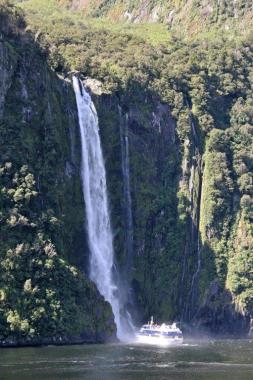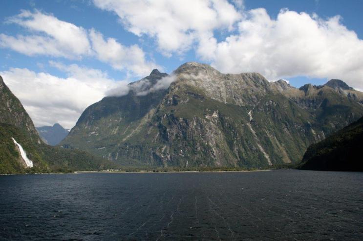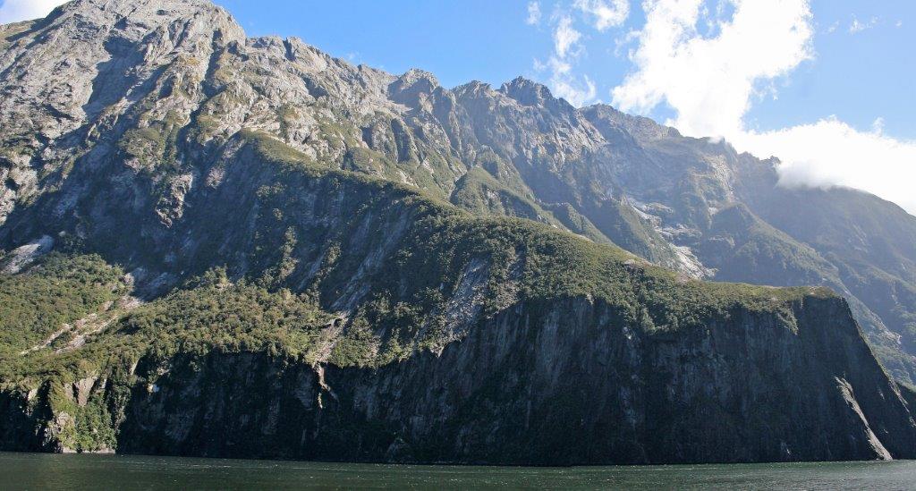 The low, gray clouds kept rising throughout the day and by the time we entered Milford sound we were blessed with a bright blue sky and sparkling sea. Milford is the most dramatic of the glacially-carved fiords. The average rainfall in Milford Sound is 20 feet and it is unusual to have a day without at least some rain. We were fortunate to have one of those days; one of the best days the captain and crew had every experienced in the area.