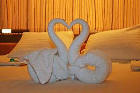 Every night our cabin stewards decorated our bed with a folded-towel animal. That night we had kissing swans.