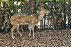 A female Nyala antelope from Africa. The males have longer hair and are greyish brown with less defined white stripes.