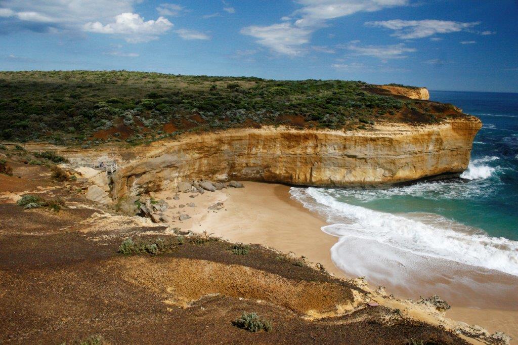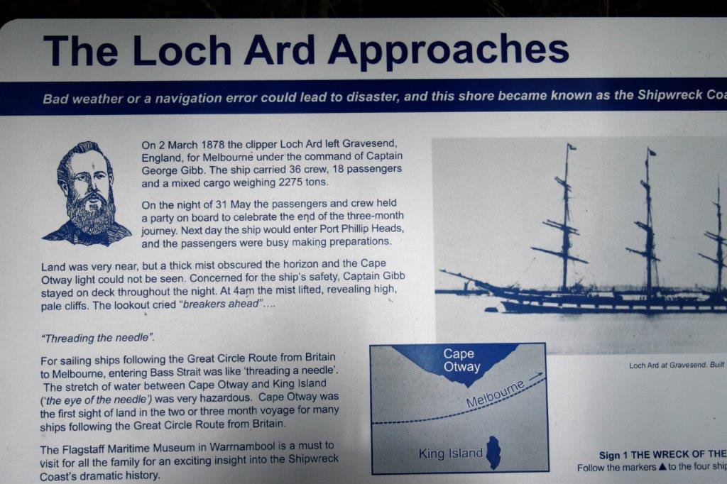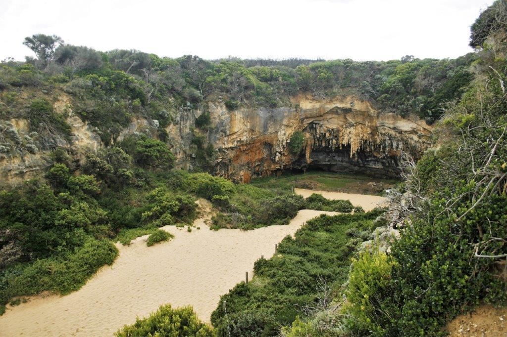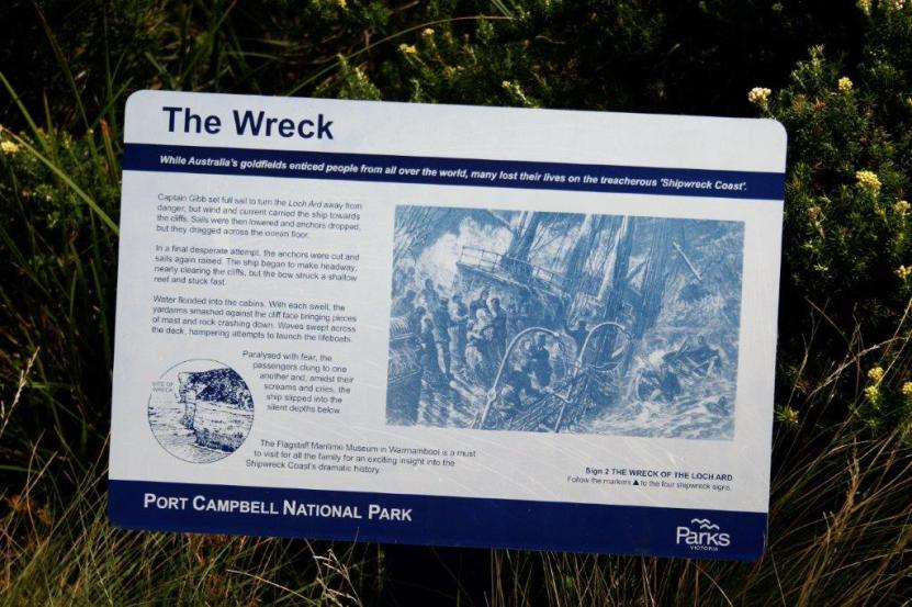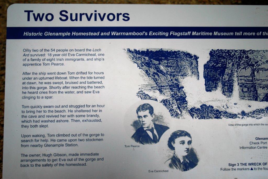 Three minutes down the road from the Twelve Apostles is Loch Ard Gorge, named for the shipwreck of the clipper Loch Ard that ran aground on Muttonbird Island at the end of a three-month journey from England in 1878 . Of the fifty-four passengers and crew only two survived; a 19-year old man who swam into the bay and a 19-year old woman he rescued when he heard her cries. The young man climbed the steep cliffs and went to find help. The woman lost four family members in the shipwreck and returned to England three months later. He stayed in Australia and died at age 49.