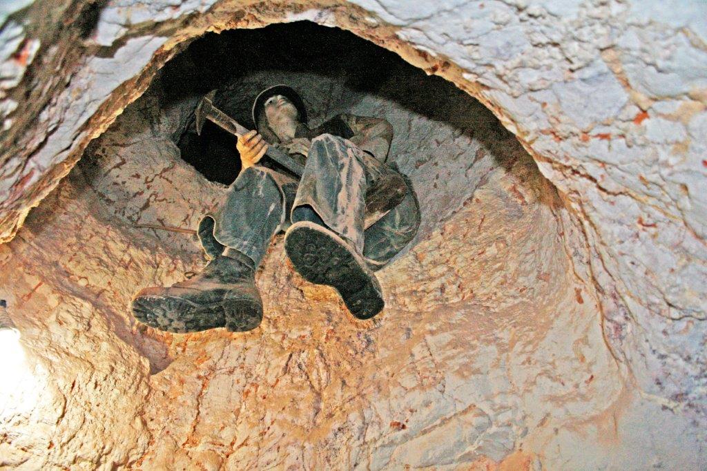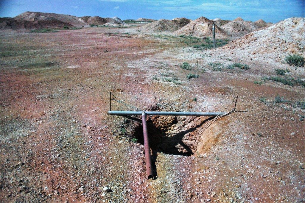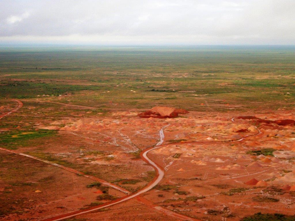As you fly over the area surrounding Coober Pedy all you see for as far as you can see are holes in the ground with piles of dirt beside them. Hundreds, thousands, of bore holes – many as deep as 100′.