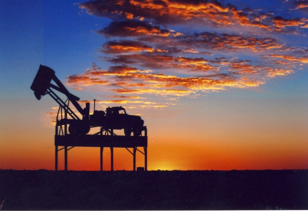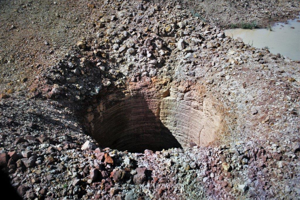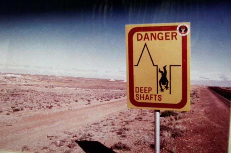 We learned later that miners drill a bore hole that is about a meter across – average shoulder width -then a fellow is lowered by rope down the hole sitting on a wood plank. As he descends he checks for the telltale opal layer in the sandstone. If he doesn’t find anything they bore deeper; if he does see an opal line they start to drill horizontally following the layer, blasting out rock and chipping out opals. The holes are never filled in even when the opals have all been removed because it is necessary for miners to know where any drilling has taken place. If the holes were filled someone may begin to drill horizontally following an opal layer thinking it was hard sandstone ground above and suddeny everything caves in because it is loose fill. It is also impossible to put back all the rock and dirt you have taken out since it cannot be compressed as hard as it originally was. The ratio of mullet (what they call the stuff removed from the bore hole) is 3:1 so you would still have piles of dirt sitting all over anyway.