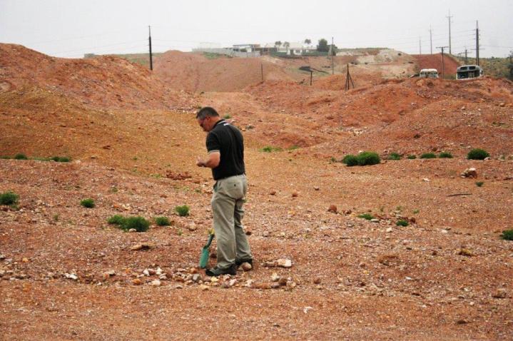 At the Opal Museum we watched a short (20 minute) film on Australian Opals and Coober Pedy. Gunter then drove us to a mine site orignally worked in 1921 and later re-worked in the early 1980s by a group that thought using a bulldozer to move the earth and find the opal layers would be effective. They soon discovered that it was not and abandoned the mine leaving behind huge piles of dirt, rocks, and opals. We spent about an hour ‘noodling’ for opals. Any we found, we could keep. John actually found a piece that was big enough and of good enough quality to polish into a marketable stone.
