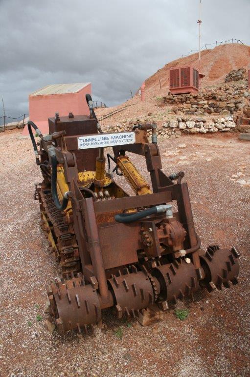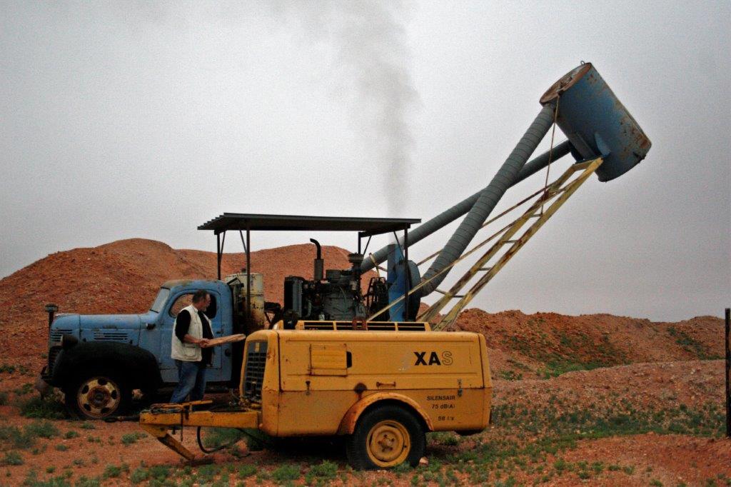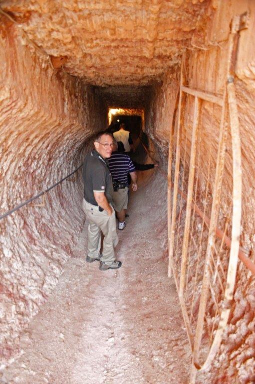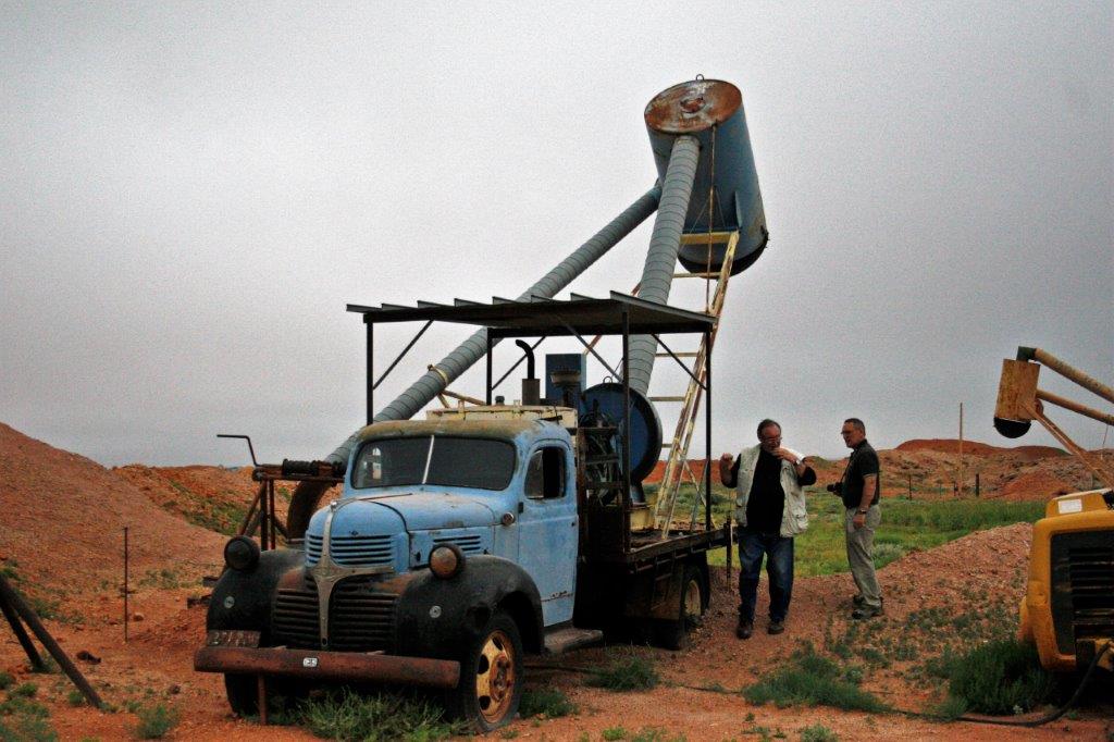 One of Gunter’s old mines was now part of the Opal Museum and he took us into the shafts. Opal miners in Australia invented a motorized vacuum hose to suck out all the dirt and rocks chipped away while removing the opals. John shoveled a few spadesful of dirt into the big hose and outside the mine Gunter started up the motor and blew the line. It is a very effective way to move rubble and clean out the mine shafts.