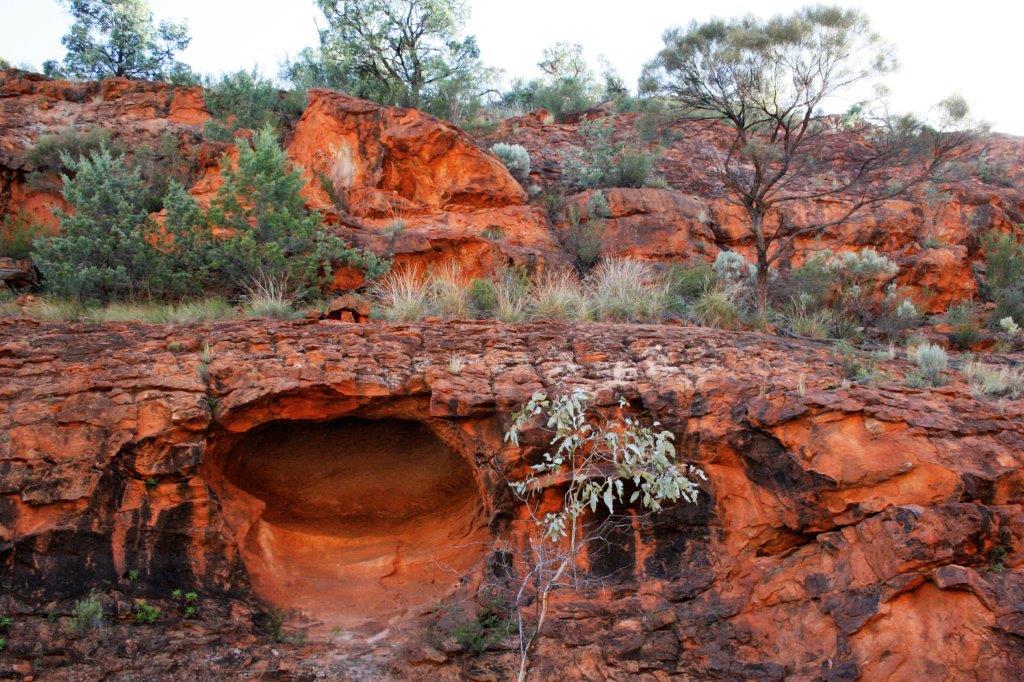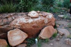 After we had eaten Gavin drove the bus over to the cultural center and we picked up Barney who was our aboriginal guide for an interpretive walk. About a mile down the road Barney led us on a short bush walk (once again we were clambering over rocks and through a creek and up steep banks). Barney explained the various plants used by his people for food, and paint, and medicines, and pointed out grinding stones and symbols carved in stone that were route information for the nomadic people .