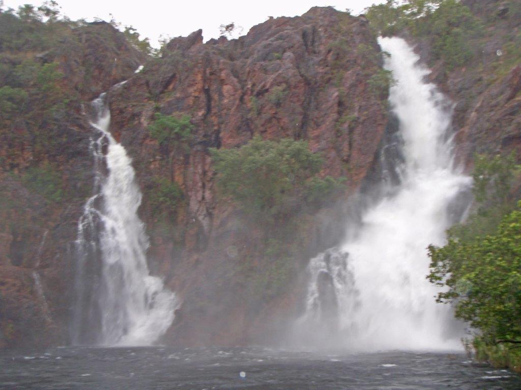 By the time we arrived at Tableland Swamp and Wangi Falls it was pouring so hard we got wet even beneath our plastic ponchos. Our pant legs and shoes were saturated by the time we walked the 200 meters to the Wangi Falls. There was so much water coming over the crest that it bounced off the walls as it fell and the mist drifted 100 meters across the pool. The whole picnic area was flooded and all of the usual warnings were posted to stay back from the water’s edge due to the possibility of crocodile attack.