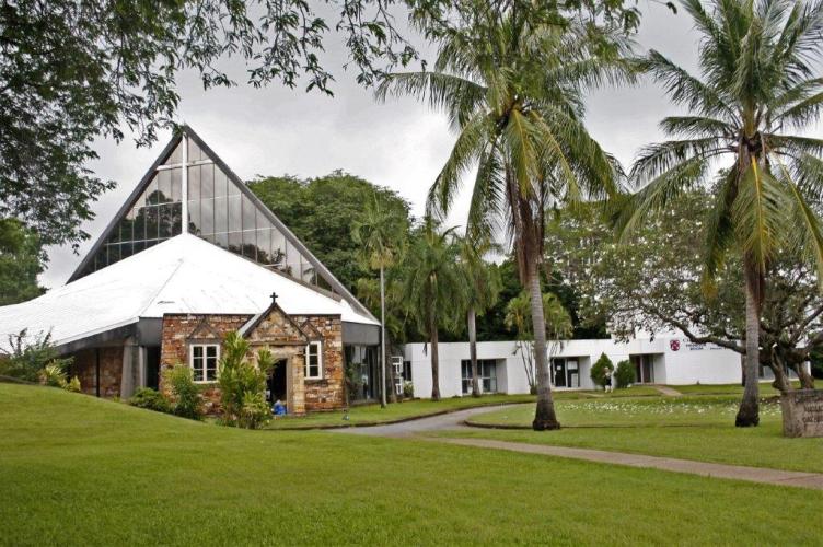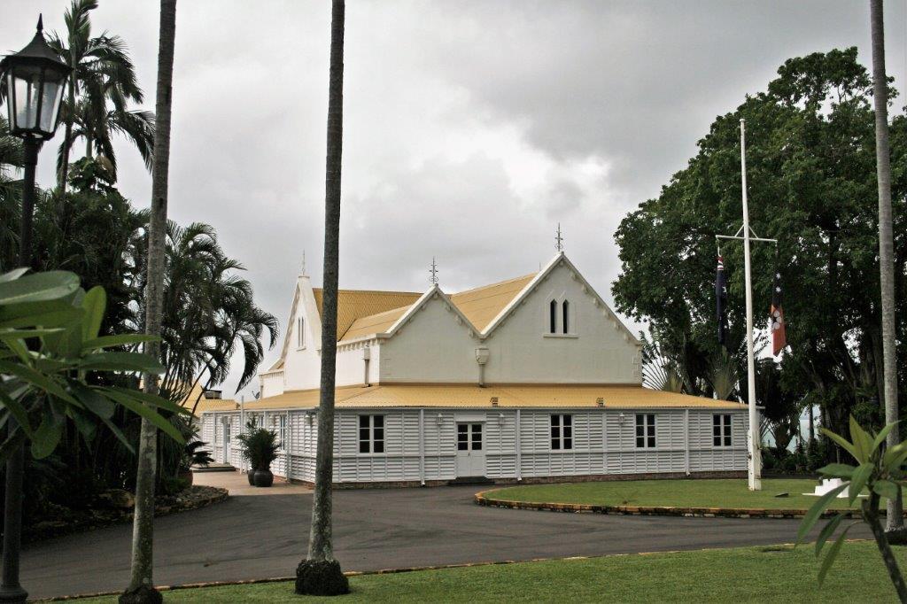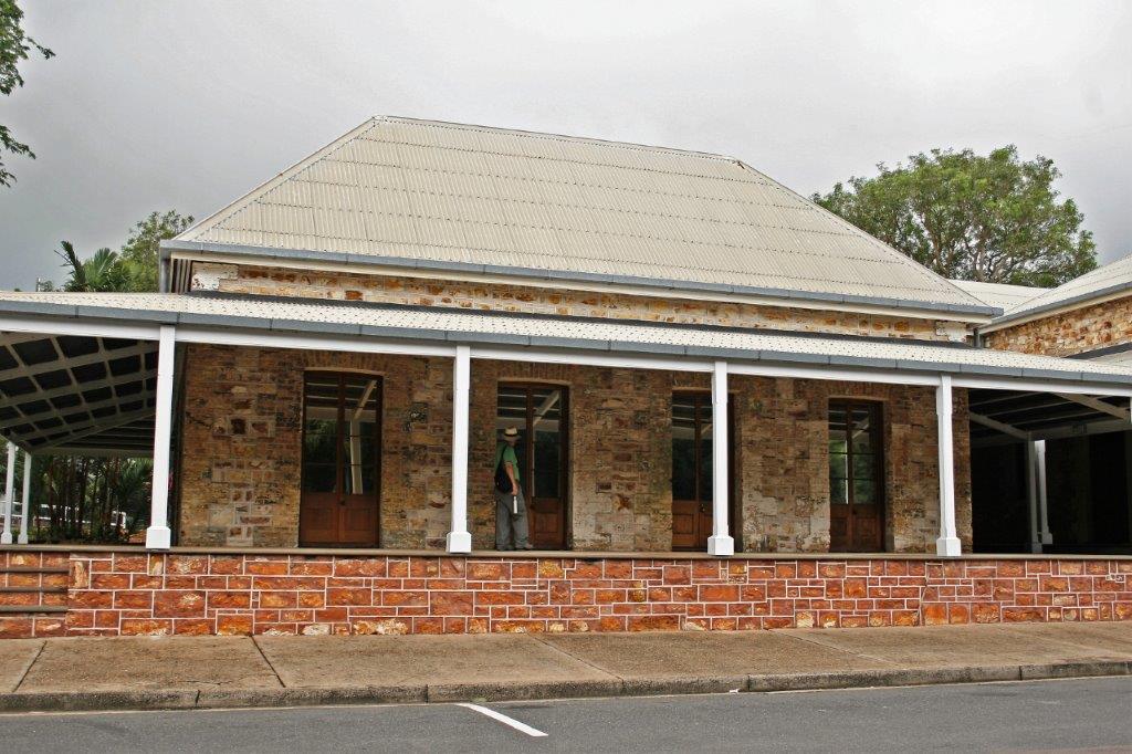 The old police station and courthouse from 1884 have been restored after sustaining damage during Cyclone Tracy in 1974. The cyclone leveled 95% of the buildings in Darwin.