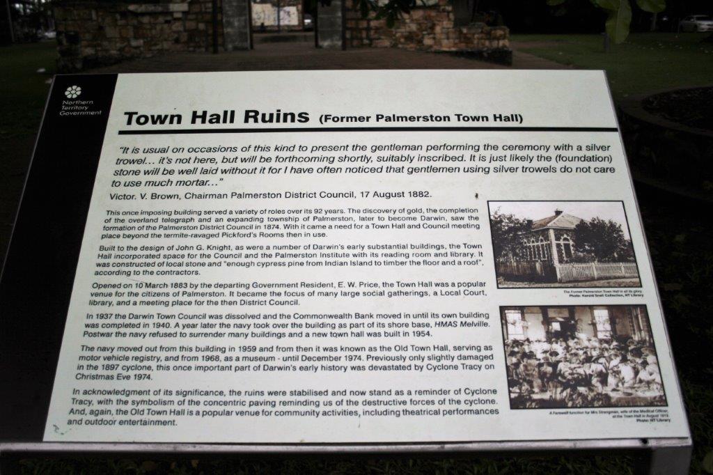Across the street from Brown’s Mart are the ruins of the old town hall. The original limestone block council chambers, built in 1883, became a naval workshop during WWII. It later became a bank and then a museum before being destroyed by Cyclone Tracy.