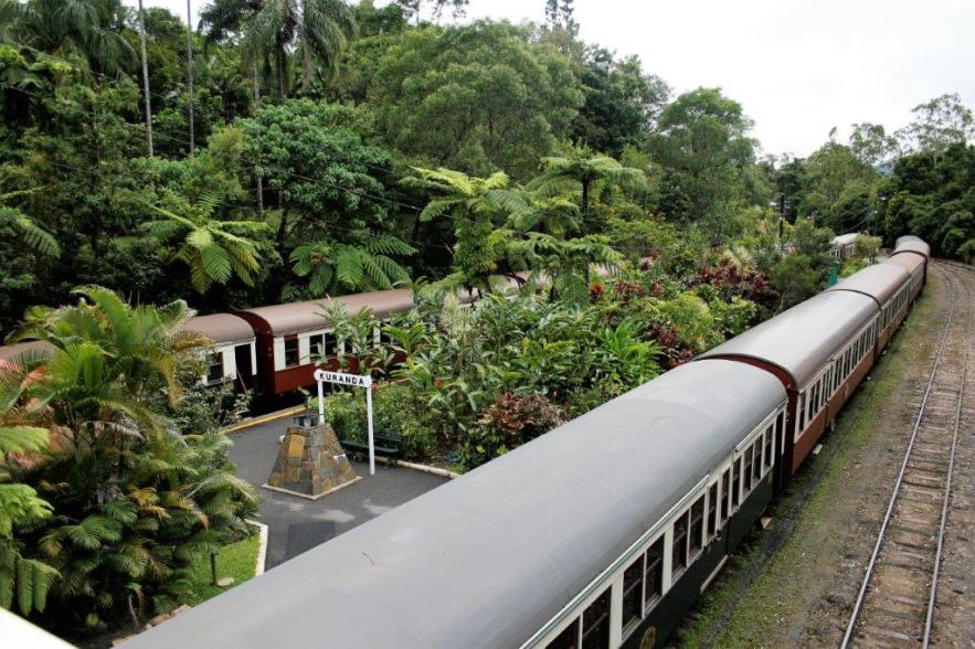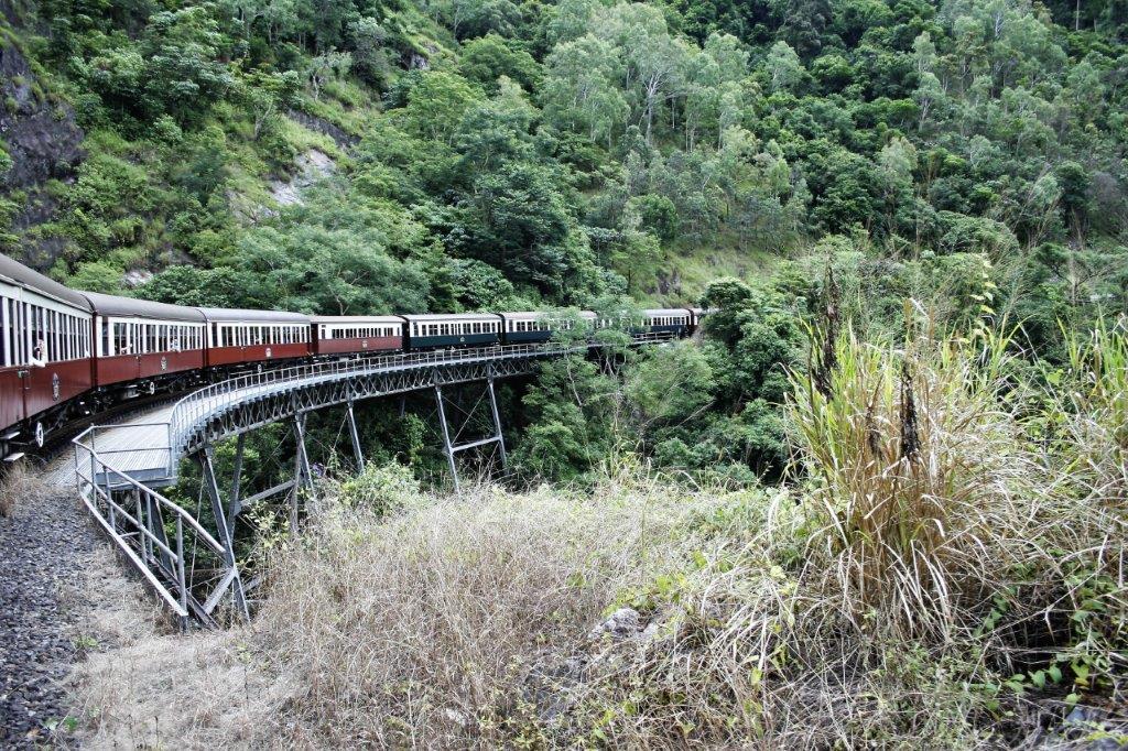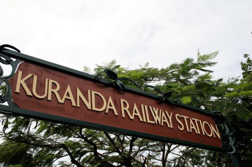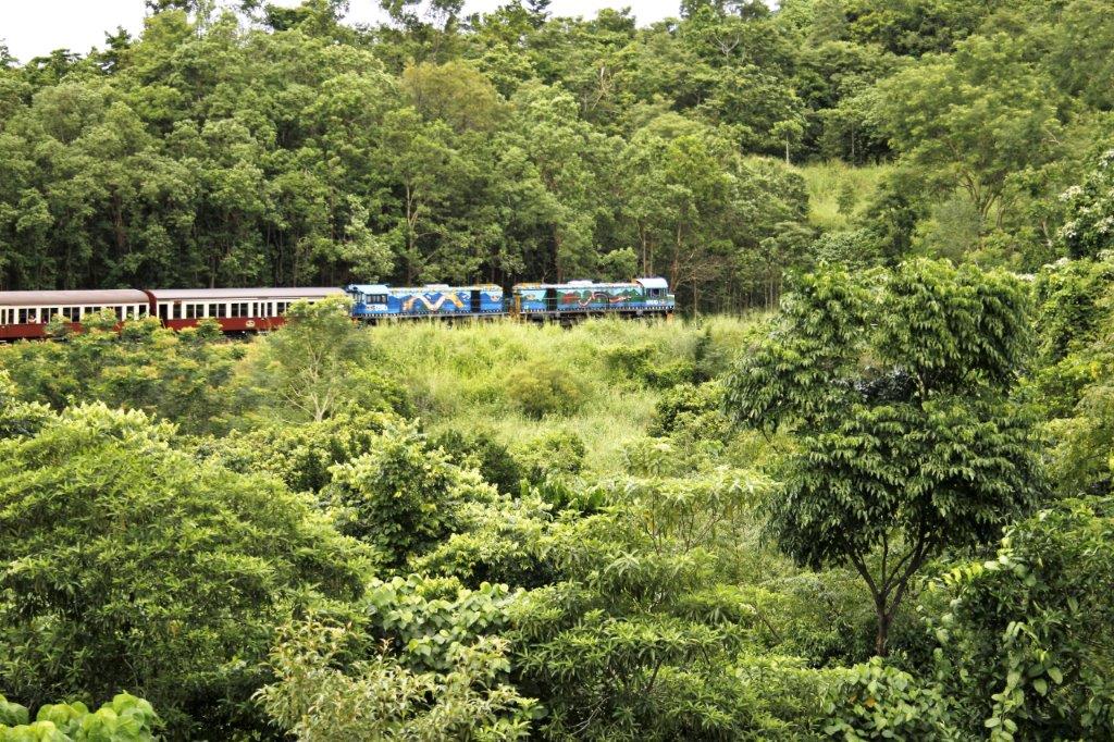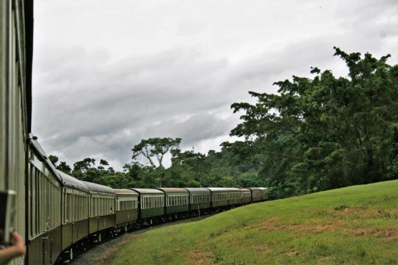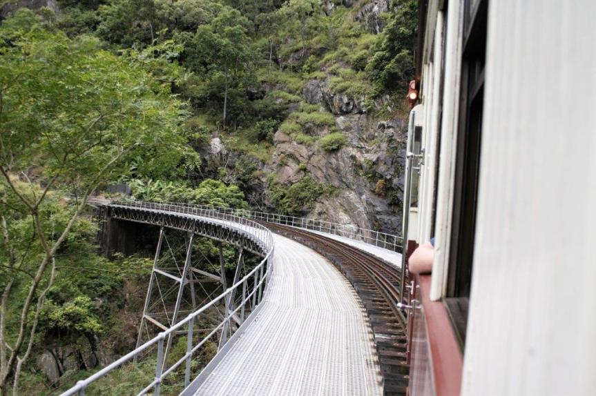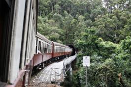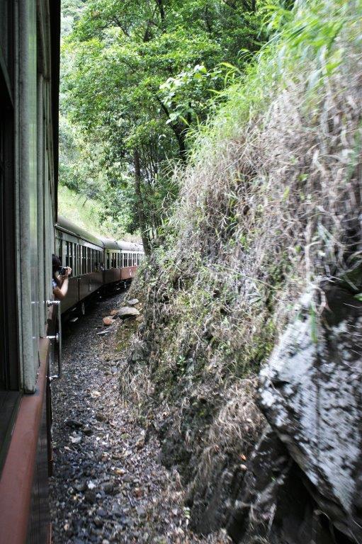 We were at the train station at 7:45 and boarded a restored 1880s rail car for our trip to Karunda. There were only a dozen or so people in our car so we all had plenty of room. The railway line was literally hacked from the cliff-sides of intensely thick rainforest to make a route to the gold fields during the wet season. The land route Bump Track was impassable in the wet. (The Bump Track was originally an Aboriginal trail between the coast and the mountains. It was blazed by Europeans in 1877 too access the north Queensland gold fields.)