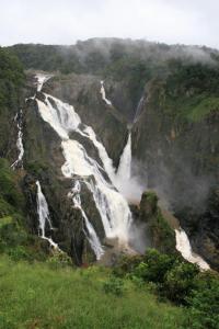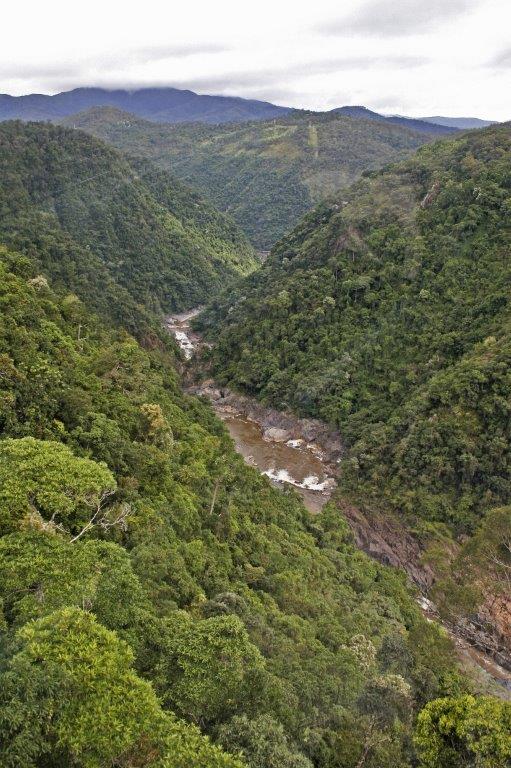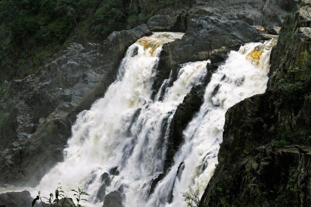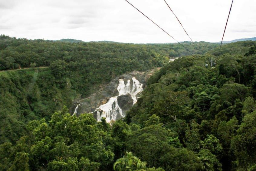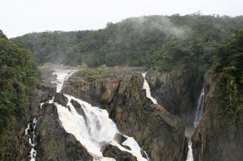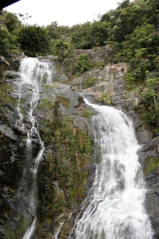The cars run on a line 200′ above the forest and the distant views of Cairns (pronounced Cans) and the ocean were very nice despite the clouds. There are 25 towers and #6 was the tallest at 120′. You can get off the tram at two stations and wander around before getting on another tram and continuing your journey. The first was Barron Falls Station where we strolled the rainforest walkways to three lookouts over Barron Gorge and Falls.