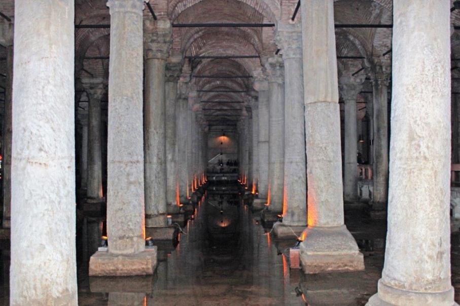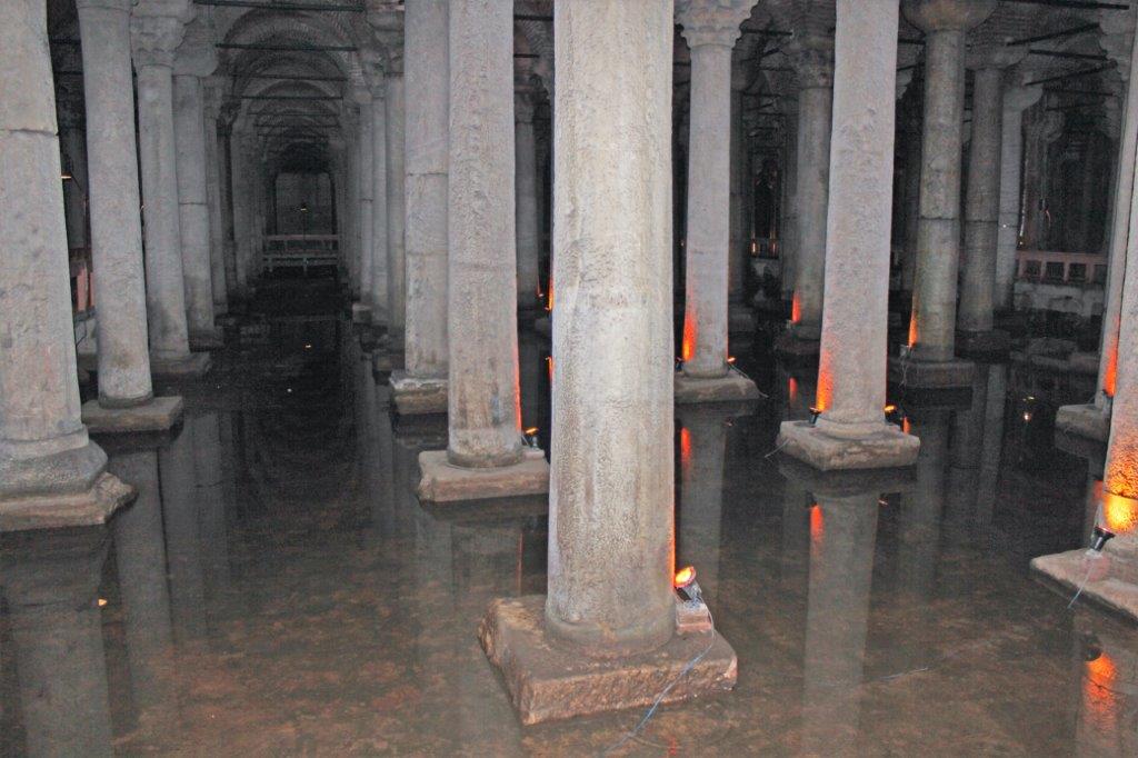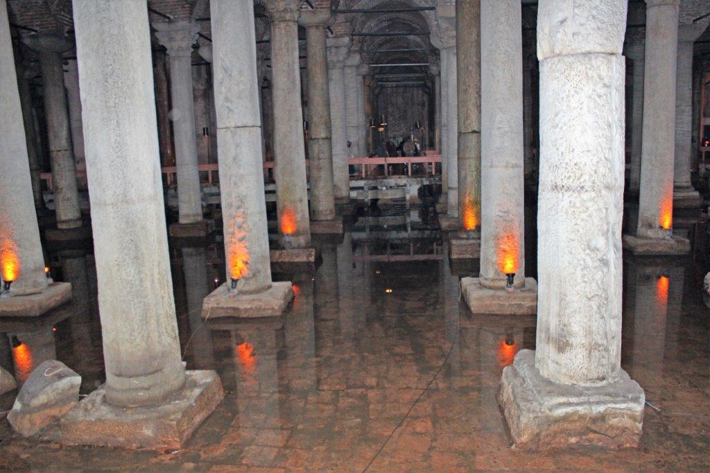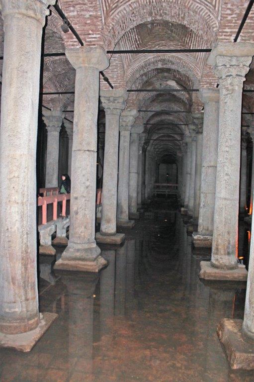 From the Spice Market we walked to the Bascilica Cistern. The Cistern (also known as the Underground Palace) was built during the reign of Roman Emperor Justinian in the 6th century. It is a huge, one-two acre, underground fresh water reservoir. The ceiling is supported by 336 Corinthian columns; many of them different shapes and heights with bases adjusted accordingly. Perhaps they were an early recycling project; using columns from old fallen or abandoned buildings.