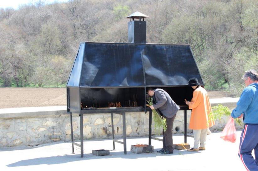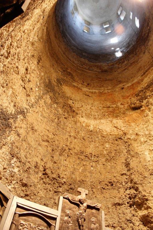 The cave was a small cut into the nearby hillside. There was a shrine inside and very colourful murals on the walls. A hole in the ceiling goes up to the chimney-like structure on the top of the hill.