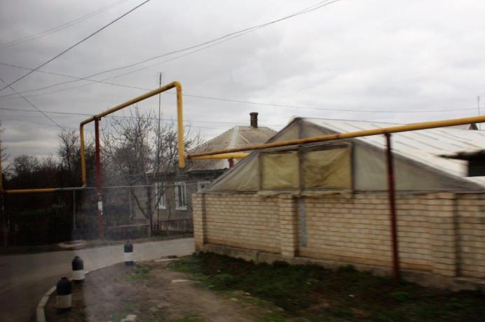 The gas line is raised over the roads or driveways to allow trucks to pass undeneath.