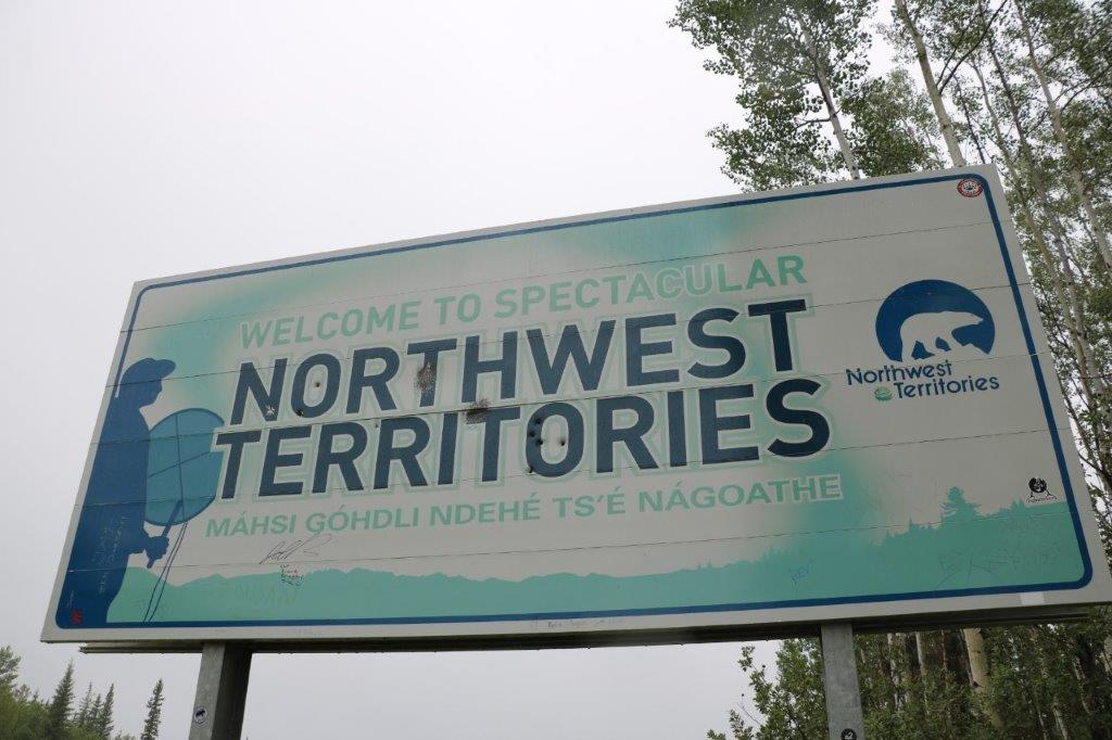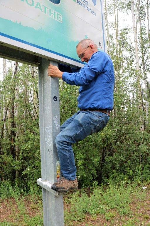 We crossed the Northwest Territories/BC border about 1 o’clock, and stopped to find a geocache that was hidden in the “Welcome to the Northwest Territories” sign. John had to do a bit of fancy climbing to get it.