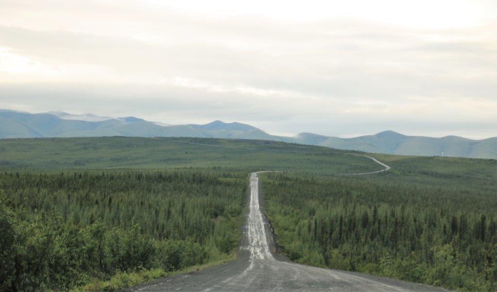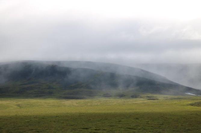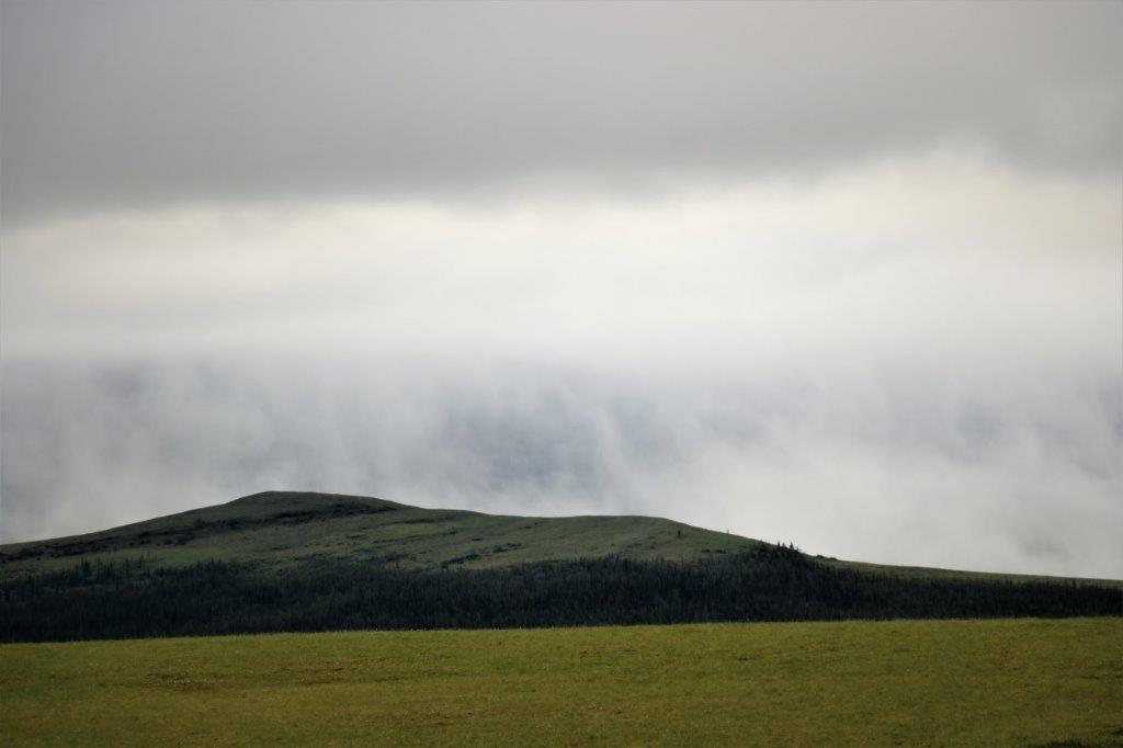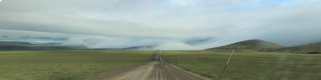 About 4 km before we reached the Yukon/Northwest Territories border the fog rolled in. This is another nasty weather condition on the Dempster. Thankfully the fog was thin enough that we could still see 100 meters or more in front of the truck.