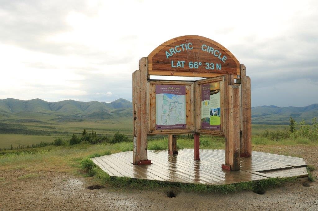 There was a geocache hidden off into the scrub behind the Arctic Circle sign. Everything was still wet from the rain and it took us awhile to find it so our shoes and pant legs were a tad wet by the time we got back.