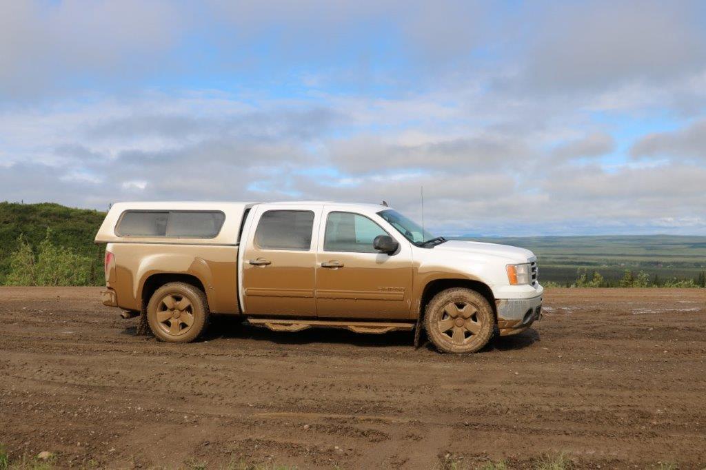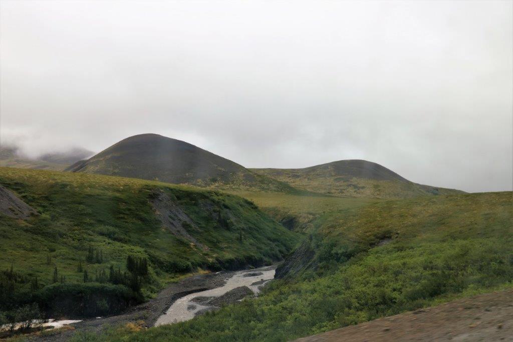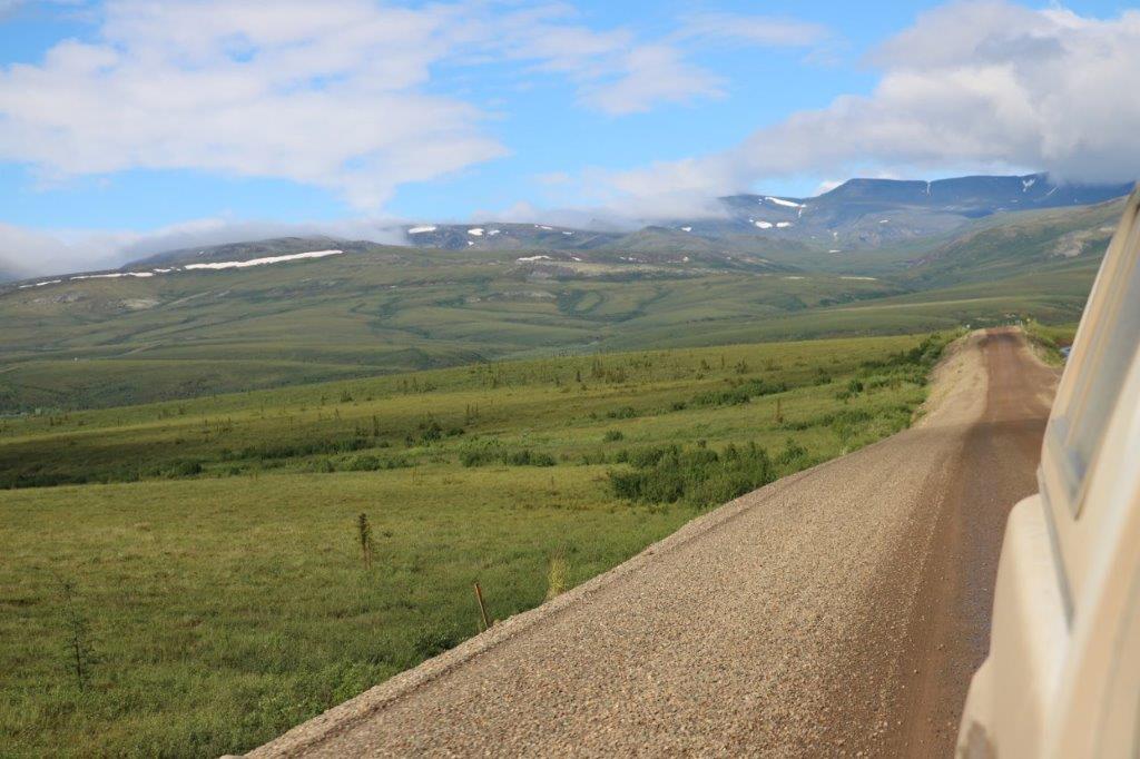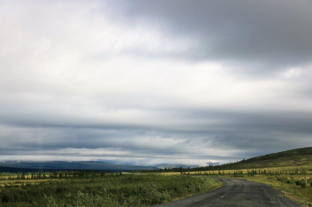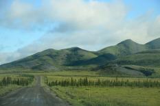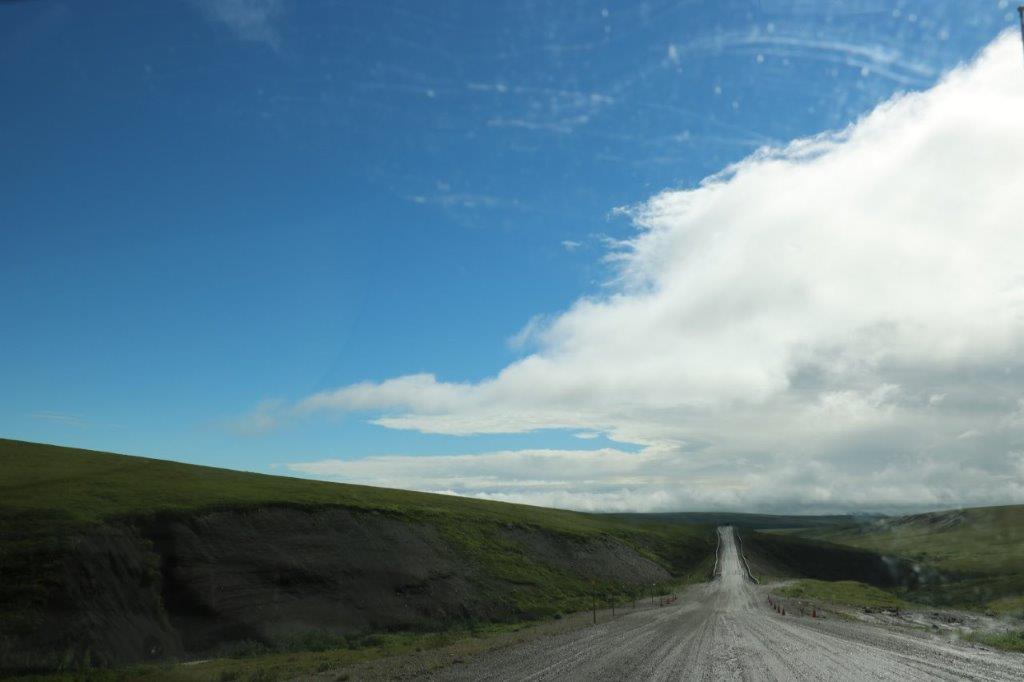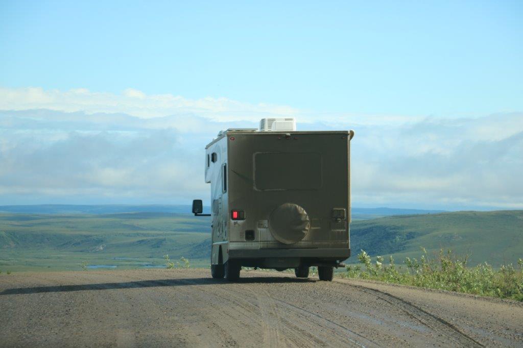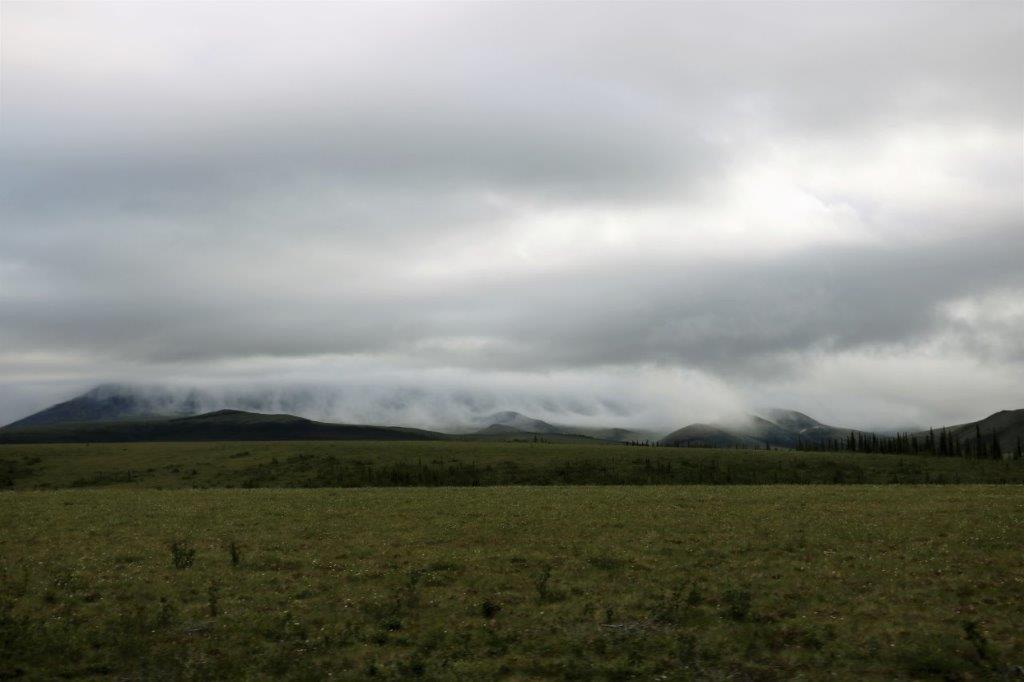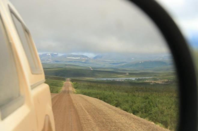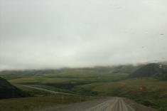 We woke at 6:45 to see that it was raining. Not a good thing on the Dempster Highway. The road is built on a gravel bed above the permafrost and when it gets wet, the calcium and other minerals in the soil leach to the surface and create a slippery mess that tires cannot get a grip on. All the space in the treads just fills up with the muck and you have no control of your vehicle.