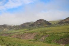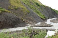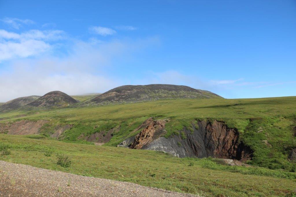 When you leave the Eagle Plains hotel/campground/gas station – population 9 – you enter the next ecoregion on the Dempster Highway. The road drops down to cross a glacial outwash channel of what was once a mighty river, but is now just a small stream, even though it is still called the Eagle River. The Richardsons are a mountain range to the east of the road that we cross at the Northwest Territories border. This ecoregion is called the British-Richardson Mountains ecoregion.