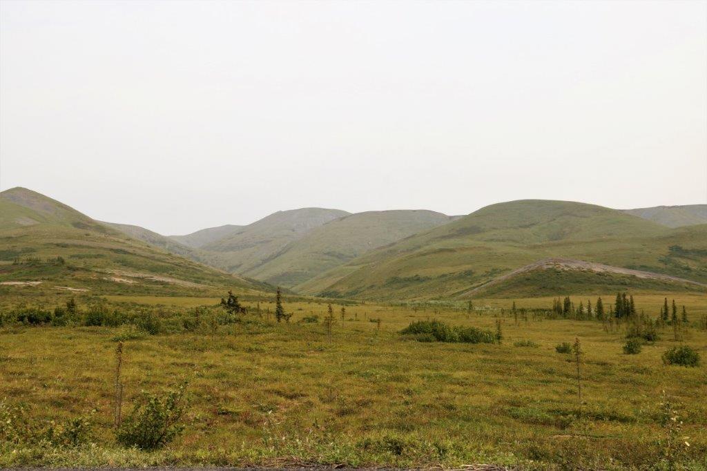 We had skipped all the geocaches hidden near the road coming into Inuvik so planned to find some of them on the way back to Eagle Plains. We were on Northwest Territories time which is an hour ahead of BC and the Yukon. Since today was just going to be a driving day once we found the geocaches we wanted, we slept in a bit and left town at 9:30. It started to rain, stopped after a short while, but we were under cloudy skies pretty much all day. There also was a smokey haze for most of the trip. We couldn’t smell it, but everything had a bluish cast. We were told it was probably coming from fires in Alaska.