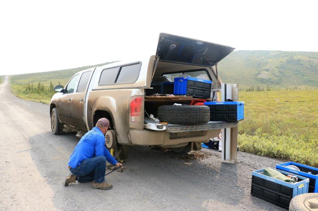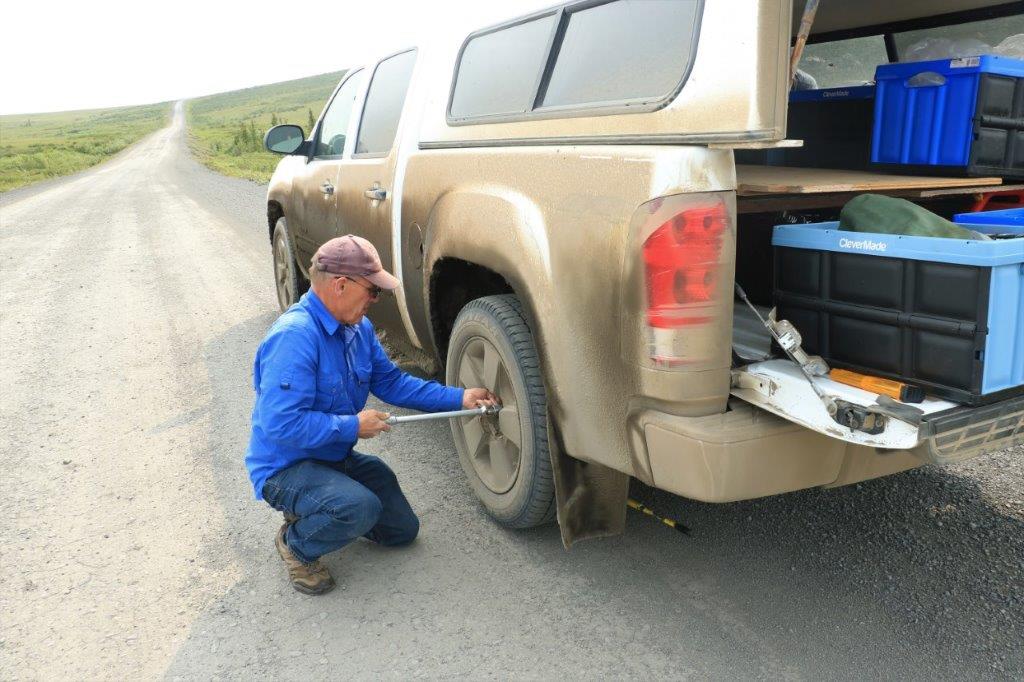 We were about 100 km from Eagle Plains and the tire sensor light came on. John had checked the tires before we left Inuvik and wondered if one of them was getting low, so he immediately pulled over to check and, sure enough the left rear was flat. After 1,100 km (683 miles) of gravel roads we got a flat!