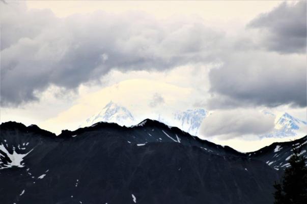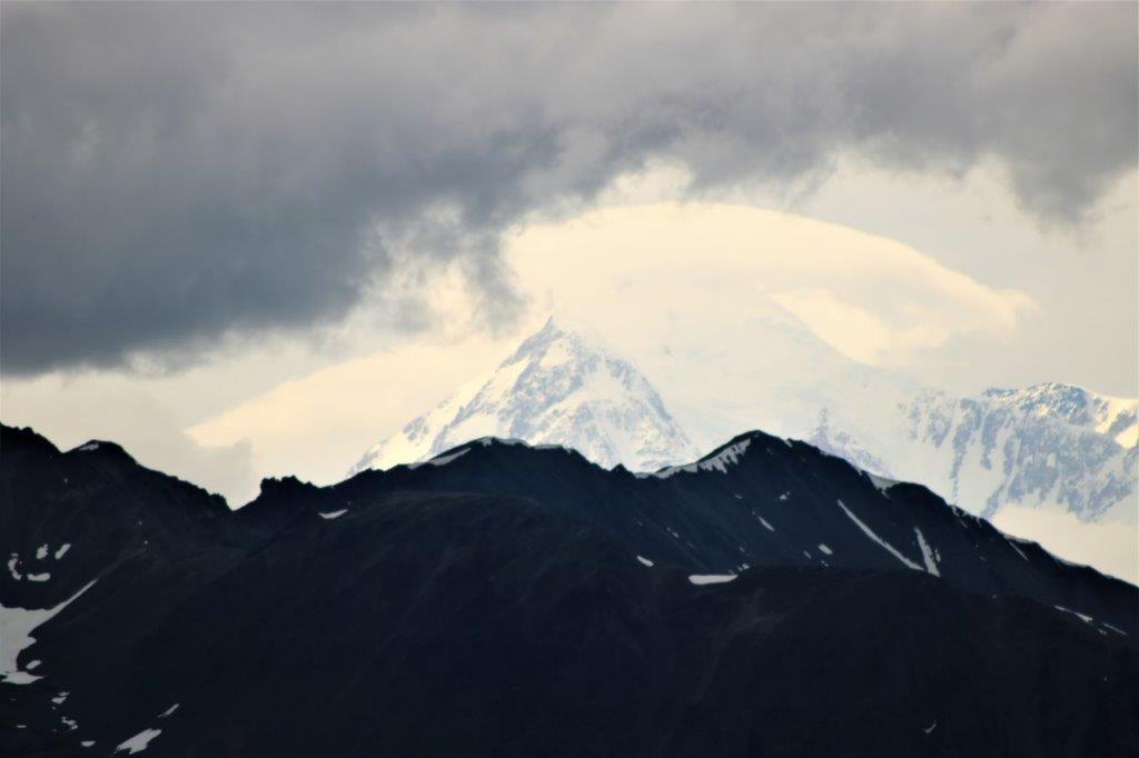 The big bright white cone on the left is a cloud covering Denali’s south peak. The north peak on the right side is free of clouds – for a few minutes.